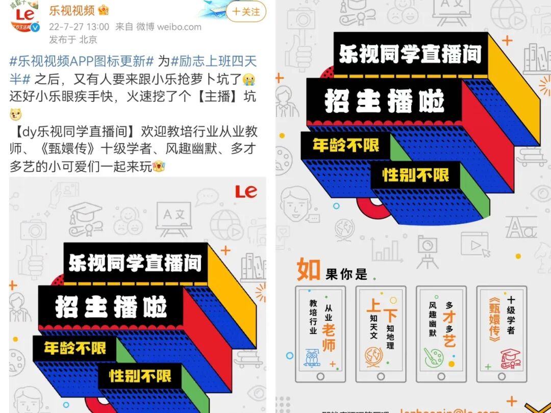 7月底,乐视便在微博发布招聘消息,表示招募主播,欢迎教培行业从业教师。而在抖音上,乐视官方账号和旗下的达人号,已经陆续开始了直播带货尝试,主播大多是自己的员工,似乎正在探索新的业务道路。