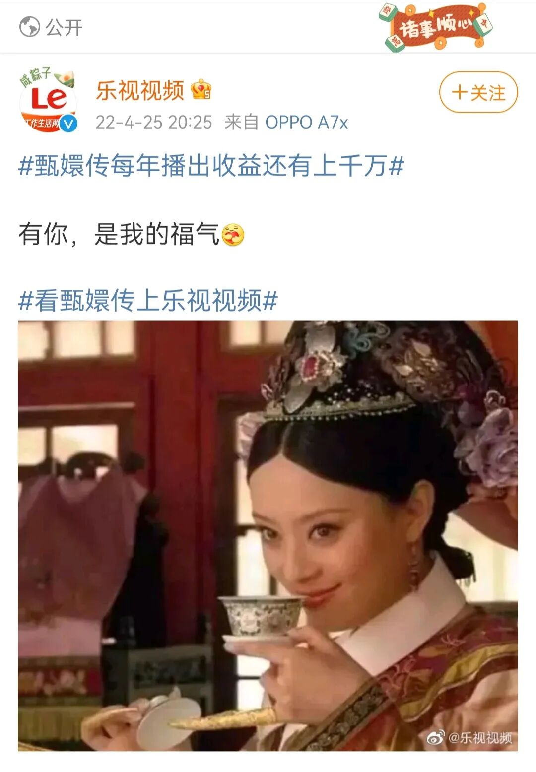 今年4月,因为各种剪辑解读片段在短视频平台火爆的《甄嬛传》上了热搜,幕后手握版权的乐视也进入了大众视野,有知情人士表示乐视每年靠版权就能躺赚上千万,乐视也随后发布微博,配上了《甄嬛传》的表情包“有你,是我的福气”,一众“甄学家”网友也开始玩梗,表示《甄嬛传》保了乐视一世荣华。