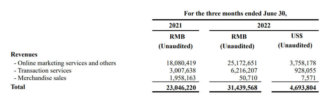 阿里巴巴长期稳坐营收第一名,属于短期内其他人很难追上的领先玩家。二季度,其广告收入虽然同比下降了10.12%,但722.63亿元的收入体量远超其他大厂。即使目前拼多多超越腾讯、百度来到了第二位,其251.73亿元营收也仍与阿里巴巴有近470亿元的差距。