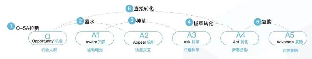 例如通过产品、工具和资源的整合,让流程更为顺畅,节省人力及时间成本;投放广告时以阶段性的数据反馈做随时测算,对营销策略进行修正和调优。并且平台也在将用户进行更细分,看其目前是处于了解、感兴趣还是已有购买行动,再据此给出不同营销玩法,巨量引擎提出的O-5A模型(机会、了解、吸引、问询、行动、拥护)、腾讯广告的5R漏斗(曝光触达、浅层互动、深层触动、转化行动、复购忠诚)其应用思路都是如此。