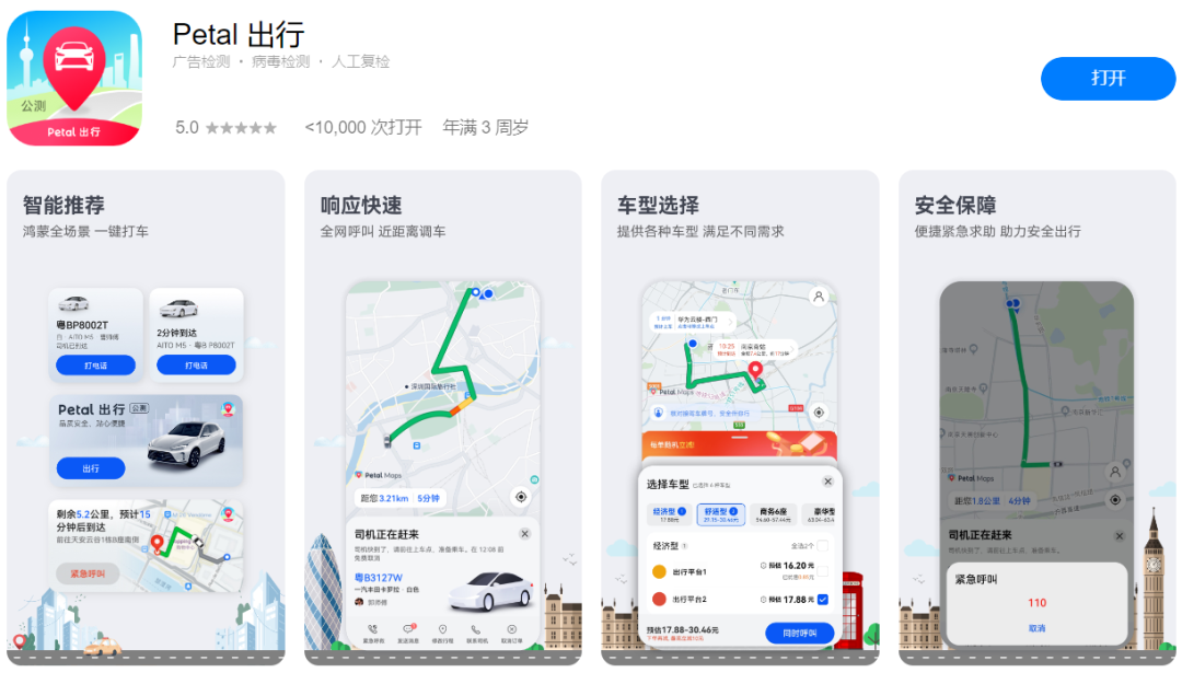 华为的步伐很快,从官宣到正式推出只过了两个月Petal出行就上线了,而且一上线就面向全国。