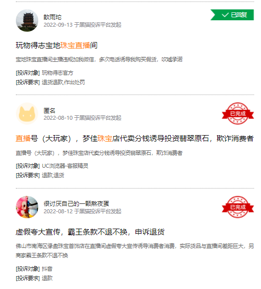 此外,在黑猫投诉搜索“翡翠直播”“玉石直播”等关键词时,也会发现诸多“货不对板”的吐槽和“要求退款”的申诉。