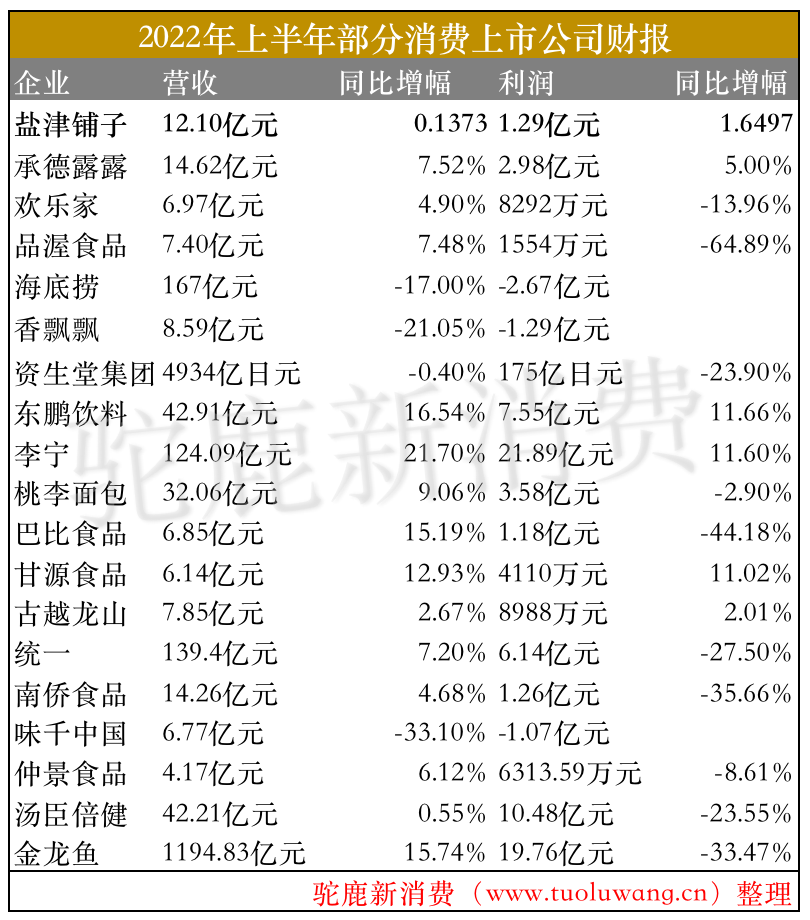 通过这近二十家不同类型的消费企业的财报数据不难看出,大多数企业在2022年上半年的营收增长都低于20%,不少企业营收增幅下降,而且绝大多数都是增收不增利的情况,净利润方面普遍下滑。