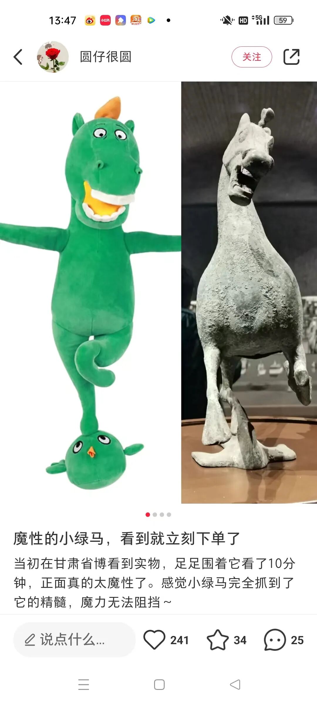 甘肃博省物馆以铜奔马为原型,出品了两款马踏飞燕玩偶,成为今年继冰墩墩之后的另一文创界网红顶流。从正面看它的表情就是如此不羁,小绿马完全抓到了精髓。听说这也是画册上从来不用它正面图的原因,太不符合它作为古老文物的身份定位了。一是因为其丑萌搞怪的神态太过解压。再者侧面一看,一马奔腾,气势汹汹。正面一看,这货居然是文物?还有一种传说,“据说叫绿码踏肺炎”,谐音梗绿“马”护体,那还不敢紧实现一户一马呀?04