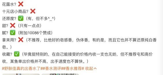 肯德基曾经推出过炸鸡味香水,泸州老窖出品过顽味香水,大白兔奶糖与气味图书馆推出过联名香水,这些都曾在互联网拥有过姓名。限时限量的周边果然是营销法宝,得不到和已失去的心理被营销人拿捏了。如今舒肤佳三十周年之际,也推出了一款纪念版的香水,大意是记忆中的香皂味道,同样也在小红书和微博上引起了热议。但评论却是两极分化,有人劝退,有人鼓掌,有人做了测评也难让大家统一意见。大约香水和口味一样,众口难调。对香水的好奇加上促销价优惠力度,倒是拉了一轮销量和声量。例如9.9买洗手液再加一盒香水,很受羊毛党的欢迎,小红书很多博主晒出了买舒肤佳送香水的笔记。07
