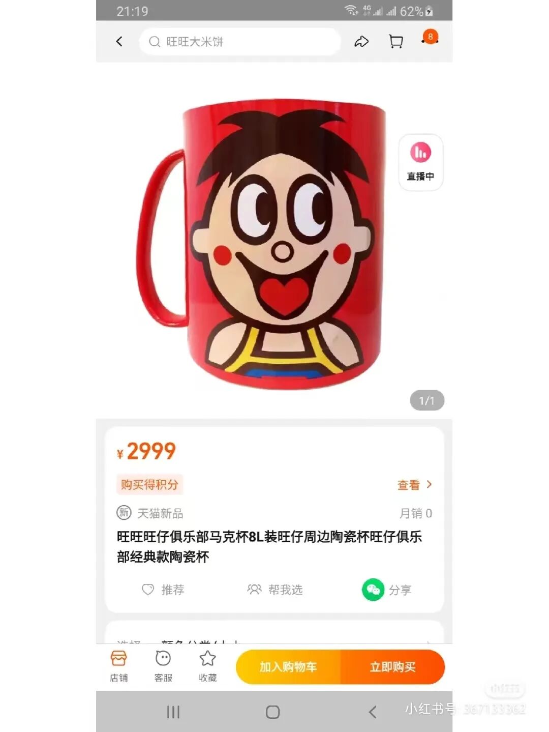 这边旺旺大杯上线没多久就下架了,那边网友已经聊嗨了。想象一下,如果真的放个仔在里面拍照也是萌萌哒,旺仔牛奶里真的有仔了。回看视频,原来妈妈给李子明送的真是8L旺仔牛奶,只能说旺旺老谋深算呀。虽然月销0,并且很快被下架,但旺旺大杯子的闪现还是给网友留下了深刻的印象。网友透露早在2018年抽奖互动的时候这个大杯子就出现过,还卖过299的价格,但在闲鱼上的价格炒到了1K+。