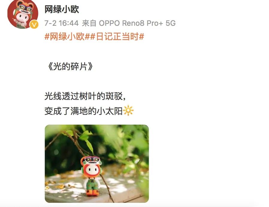 OPPO 18周年之际,很多博主收到了小欧寄来的一封信和小欧纪念手办。2G冲浪的我这才发现,原来小欧已经不是街头斗舞的网红,而是变身“知名网绿”质感升级啦,属实被惊艳到了。相信很多人记得那个穿着充气服装,在街头和Vivo各种斗舞的绿色小伙,搞笑又中二。但现在的小欧,是微博座拥100多万粉丝的知名“网绿”。每天在微博发布光影大片配暖心文案,漫画、周边都有涉猎,走起了质感十足的文艺周边路线。作为代表OPPO官方的实体形象,小欧还曾出现在网球大满贯赛事相关的活动现场,挥拍的样子很有力量感。网绿小欧的周边也打开了创意的格局,有小欧手办、项链、水杯、口罩、中秋礼盒等等等等,就是一个完全独立行走的IP。真是男大十八变,越变越好看,感叹这些年OPPO把自家熊孩子料理的如此优秀。06