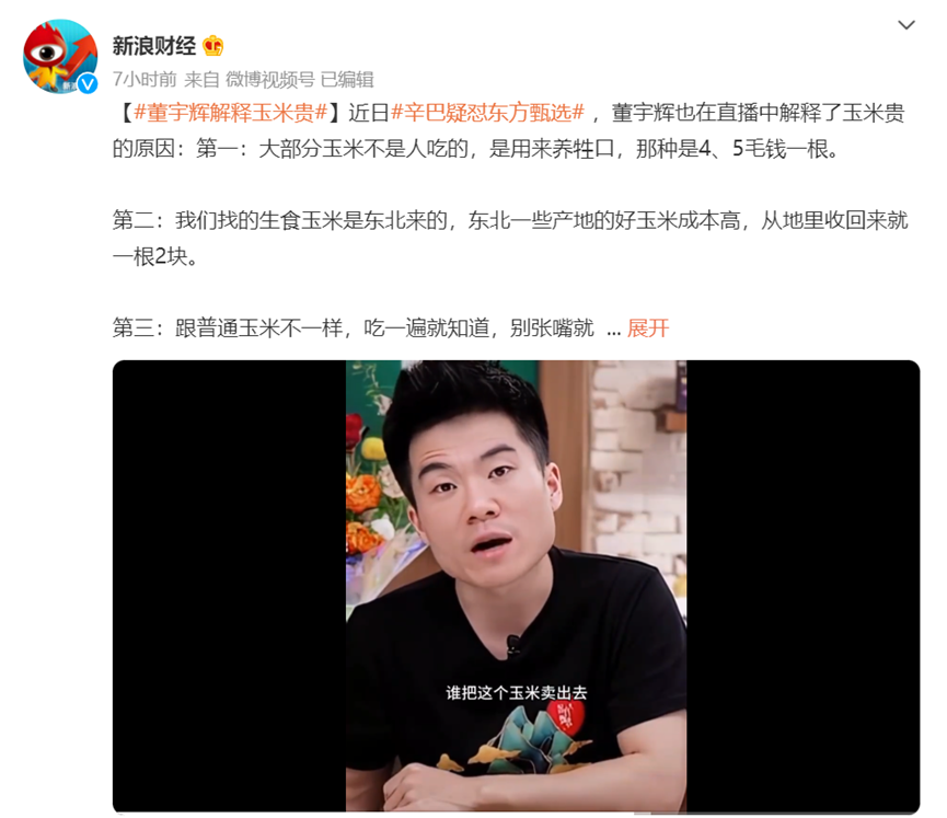 回应内容很多,但核心很简单。其一,东方甄选直播间所售玉米和普通玉米并不一样,不同玉米收购价也并不相同,其玉米从地里收回来一根就两块钱了。董宇辉还表示,吃一遍就知道,别张嘴就胡说。