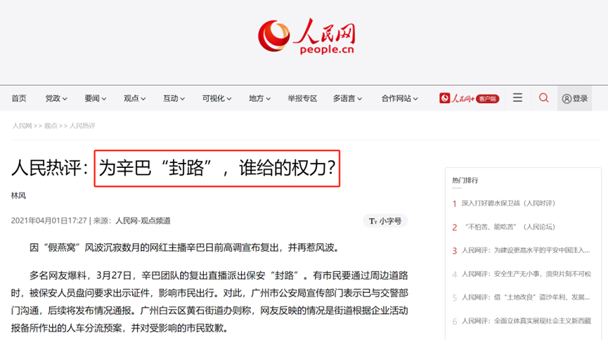 最终,引得人民网下场痛批:为辛巴“封路”,谁给的权力?