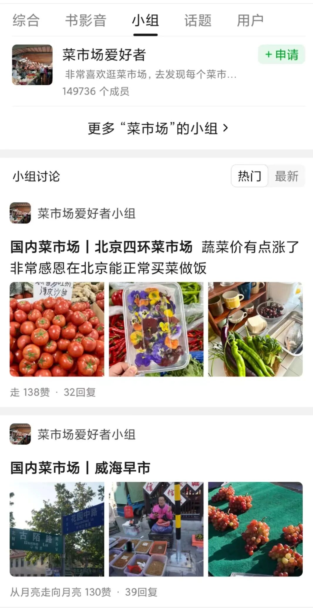 现在,年轻人对探索周边菜市场充满兴趣。在小红书上,美食博主把探索菜市场加入常规选项;在豆瓣上,“菜市场爱好者”小组拥有至少14万成员,每天菜市场打卡和新鲜事物都是分享内容。