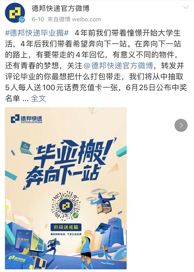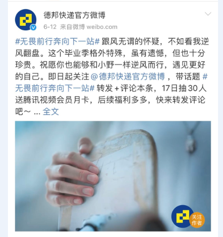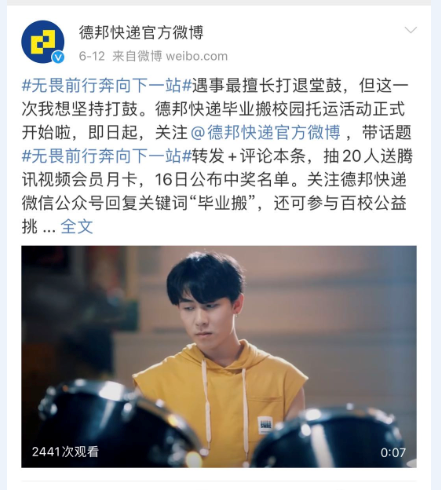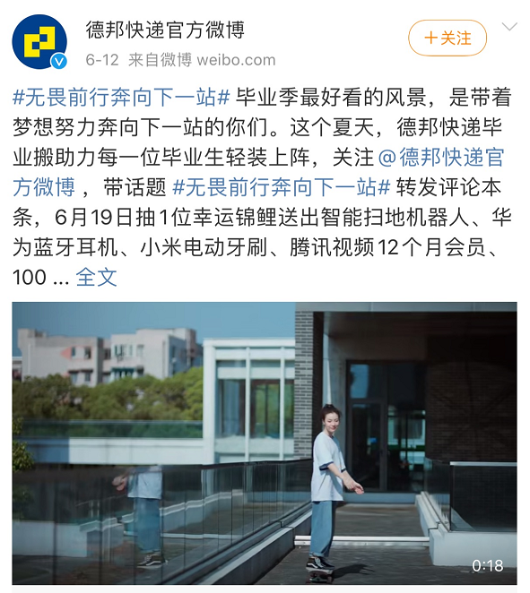 品牌的营销活动,是否能够链接起消费者的情感,还取决于能否通过强社交性属性的话题内容,吸引用户参与,并使得用户主动传播,为品牌发声。在social传播方面,德邦快递官方微博除了发布视频创意,告知毕业搬活动外,还同步发起超级话题#无畏前行奔向下一站#,具有超强的社交属性和争议性,引发用户主动参与讨论,层层推进,带动社交专题活跃度,最终实现话题热度高度转化,目前该超话阅读量已达1.3亿。超话评论区自来水积极讨论,官方即时互动,给予答复。蓝v新世相、中国新闻周刊、人民创意等大号积极转发互动,提升了品牌传播整体曝光量。在官方微博端,德邦快递率先以百元话费作为激励,引导用户持续关注。随后连发四轮福利,网友转发带标签话题#无畏前行奔向下一站#,即有机会赢得腾讯视频会员卡、话费充值卡等多项奖品,19日还将抽取1名超级锦鲤,1人独享智能扫地机器人、华为蓝牙耳机等多重好礼。微信端,只要关注德邦快递微信公众号回复“毕业搬”,即可参与活动,在百校公益挑战赛中为母校助力赢百亩公益林冠名权,同时也有机会获得智能扫地机器人、华为蓝牙耳机、200元现金红包、百元话费和天猫购物卡等丰富奖品。