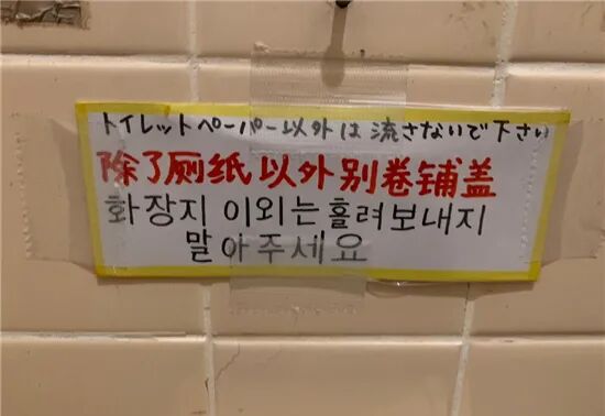 “请不要把除厕纸以外的东西,丢入马桶”