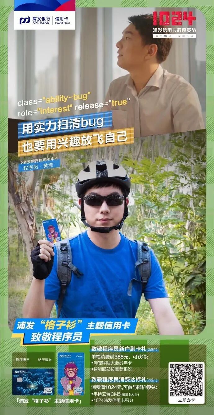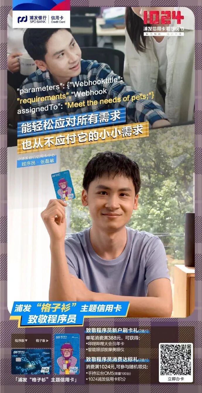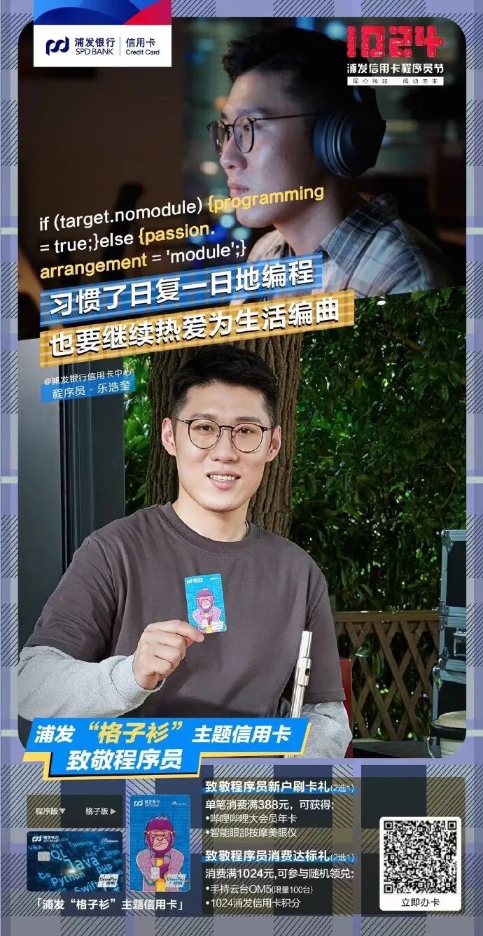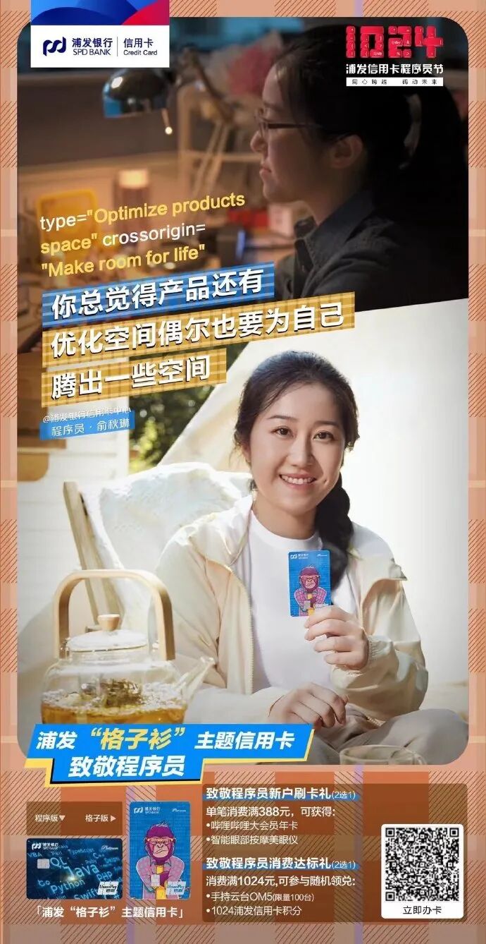 而在品牌价值定位之外,浦发银行信用卡也通过具象的活动,来落地这一情感诉求。就比如这次的“1024程序员节”,浦发银行信用卡的创意是AB式的——可爱的程序员vs多面的生活家。A面是真实的生活,以及不断出现的各种挑战,B面是生活的热爱,它同样需要全情投入。真实感是建立与消费者共识,甚至是共情的基础。浦发银行信用卡的品牌诉求,没有空泛的情感,而是尊重A面的事实,但同时也鼓励更多程序员活出B面的精彩,并将这种“鼓励”提炼为一个个具体的场景。首先在「身份认同」上,浦发银行信用卡推出“格子衫”主题信用卡,进一步增加程序员这一客群的归属感和认同感,分别推出程序员专属的“程序版”和“格子版”两种版面。
