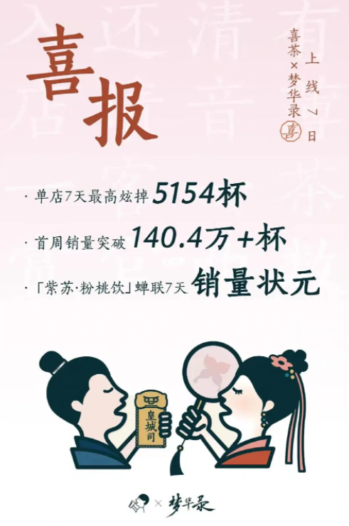 《梦华录》本身的茶文化不仅与喜茶高度适配,而善于营销的喜茶更是将“录人”(梦华录的粉丝自称录人)的心理揣摩得一清二楚,喜茶x《梦华录》联名款的销售成绩在首周就突破了140万杯。