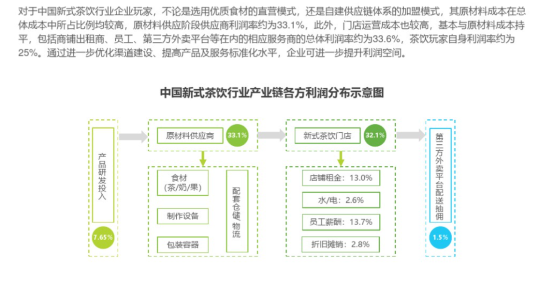 首先,是成本关。《中国新式茶饮行业研究报告2021》数据显示,因为中国新式茶饮成本占比较高,茶饮企业利润率约为25%。