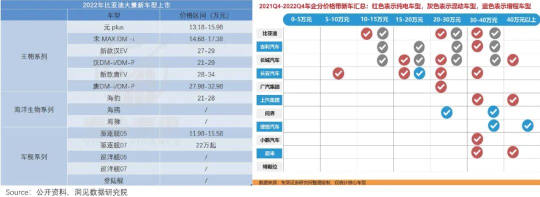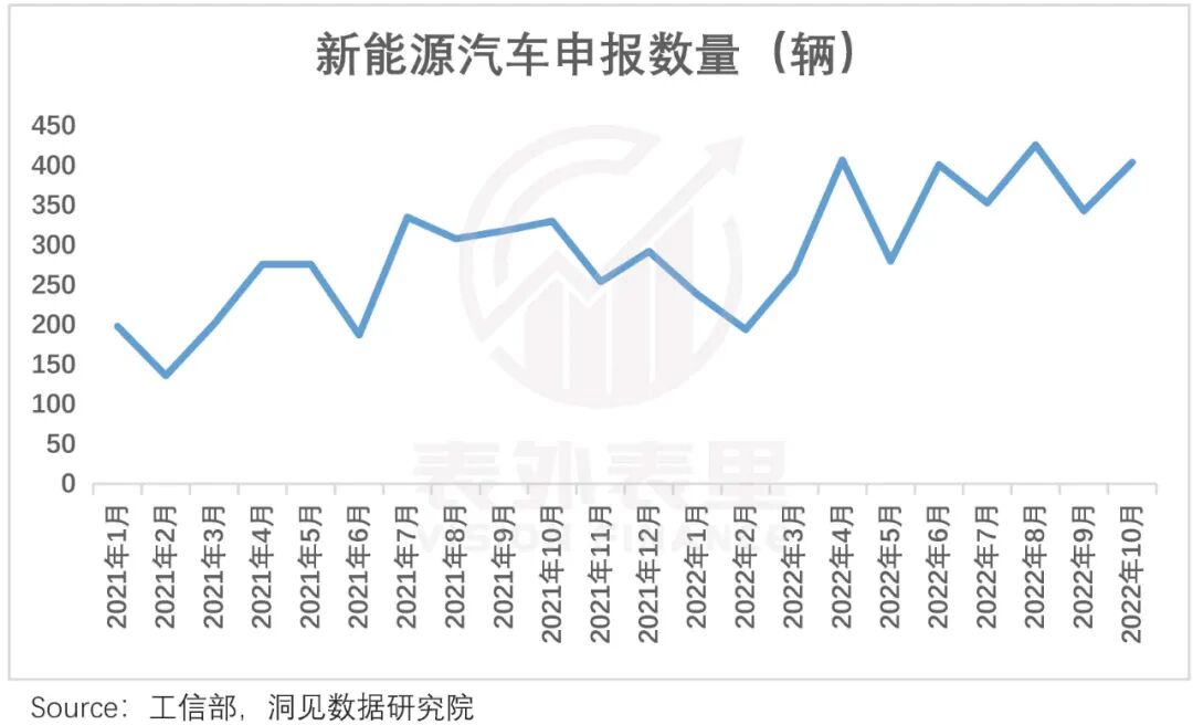 各玩家都加速向前跑,推高了新能源汽车整体的产品供给。如下图,2022年以来,每月申报的新能源新车型明显增多,目前已达400辆以上,是2021年初的2倍。