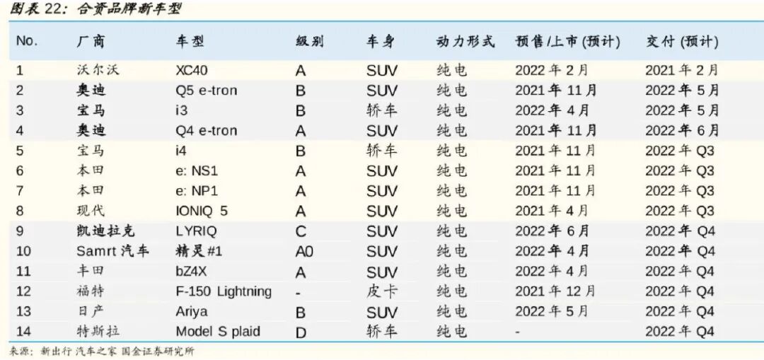 可以看到,这些品牌产品逐渐从“油改电”切换到纯电架构,加快了新能源产品的投放。2022H2将上市的达10款,全年总计将达15款。