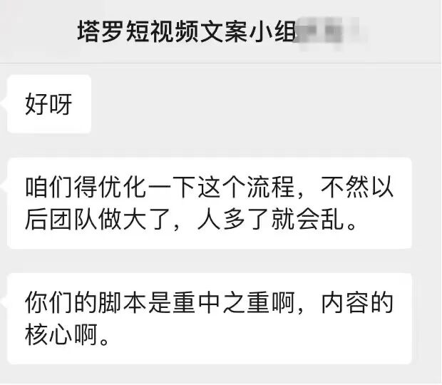 在张佳看来,很多塔罗师不过是个“演员”,账号能做起来,和短视频策划团队也有很大关系。“塔罗师根本不懂短视频传播逻辑,他们写的脚本基本需要编导重新修改一遍,设计‘钩子’吸引观众来看,再转化为私域流量。”