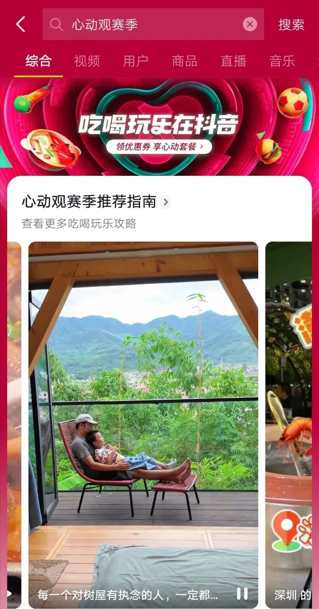 最大限度地制造话题热度,吸引不同圈层的用户参与,在带给用户吃喝玩乐全方位、高品质的活动体验的同时,真正和所有用户玩在一起,打成一片,这是我们可以窥探到的抖音生活服务“心动观赛季”的深层目的。