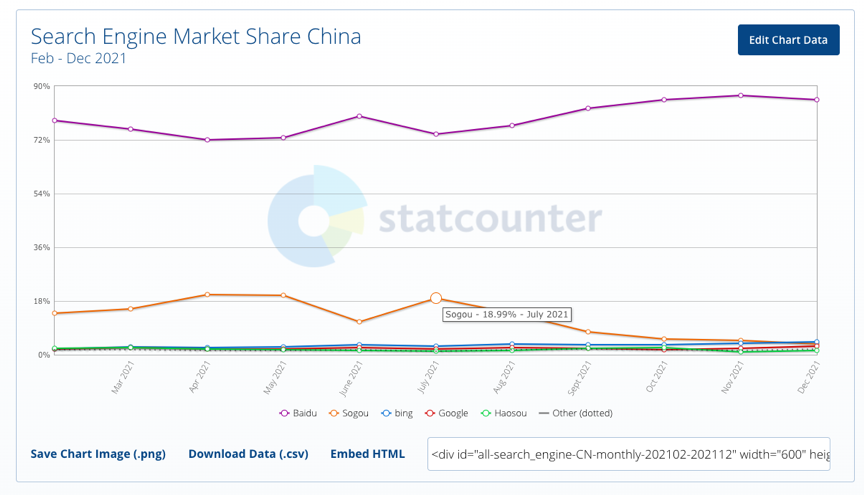 StatCounter数据显示,截止2022年Q2,在中国搜索引擎市场,百度占据综合搜索领域(包括PC端和移动端)63.17%的市场份额,移动端占据了79.66%的市场份额。排名第二的必应市占率只有13.54%。