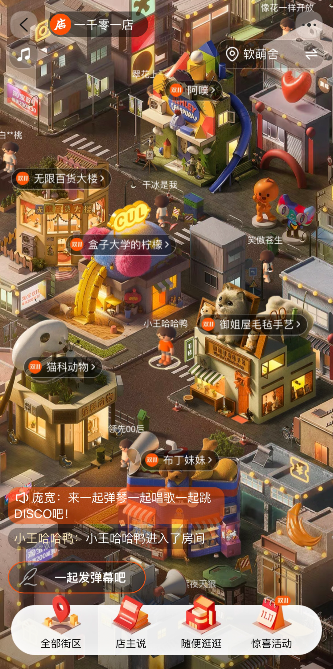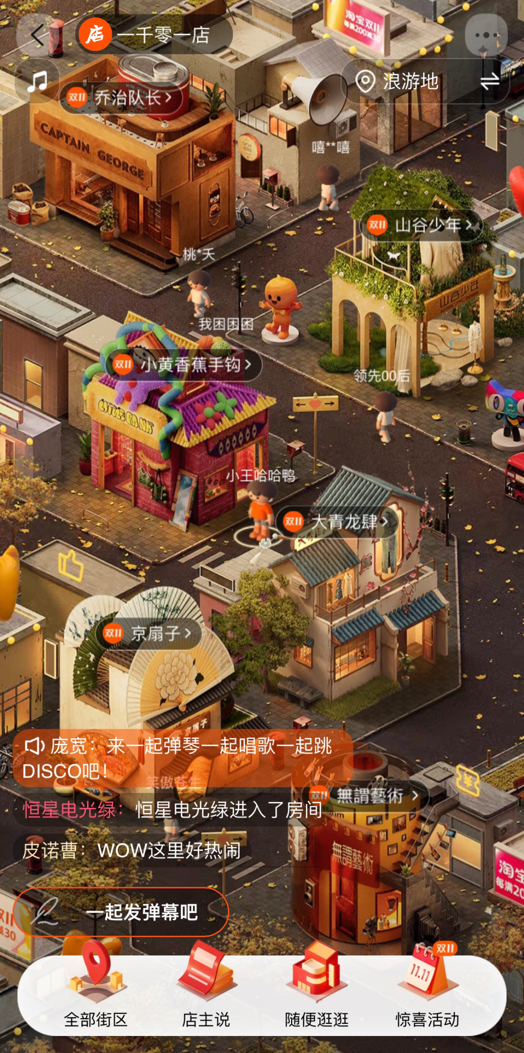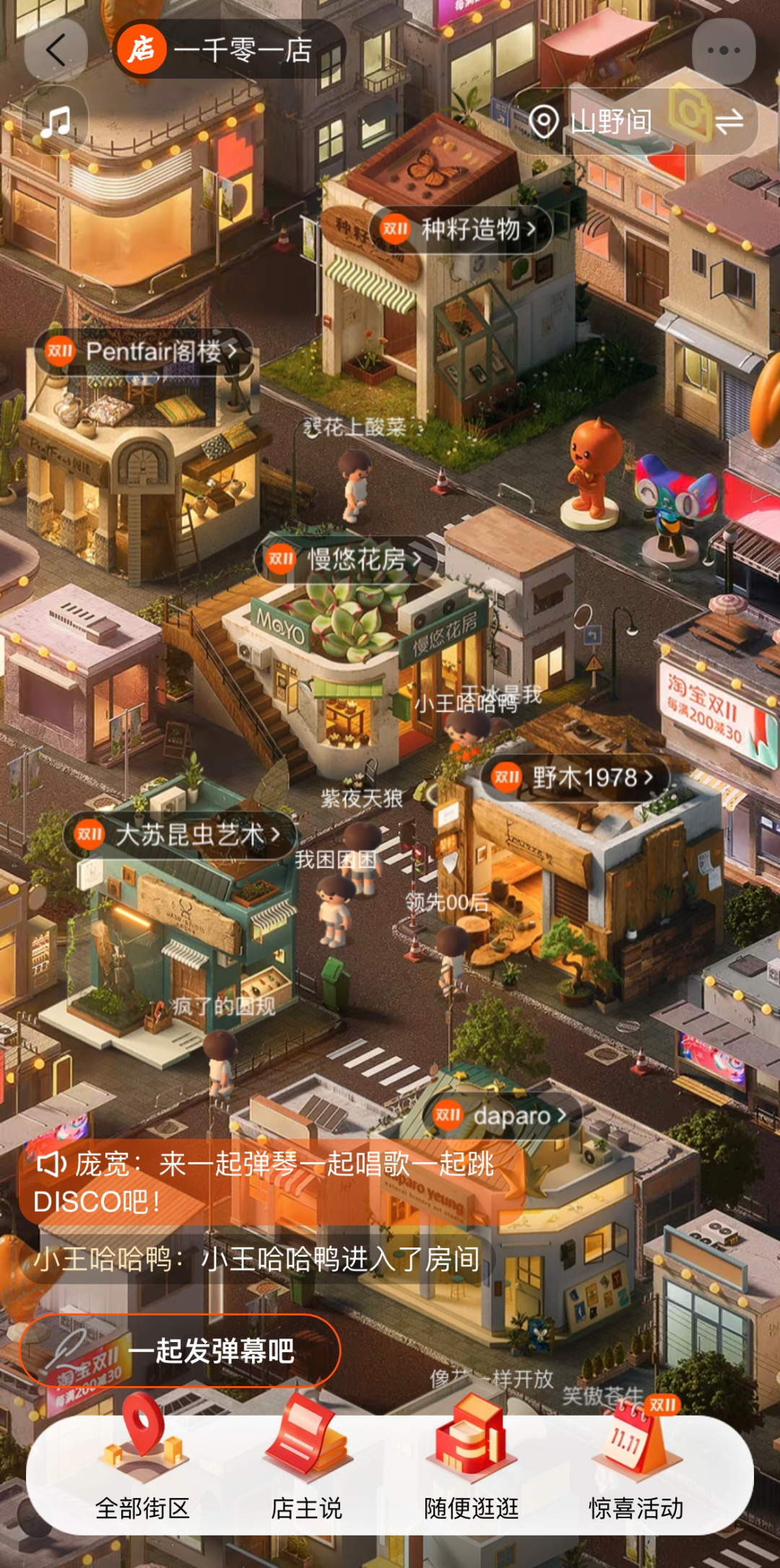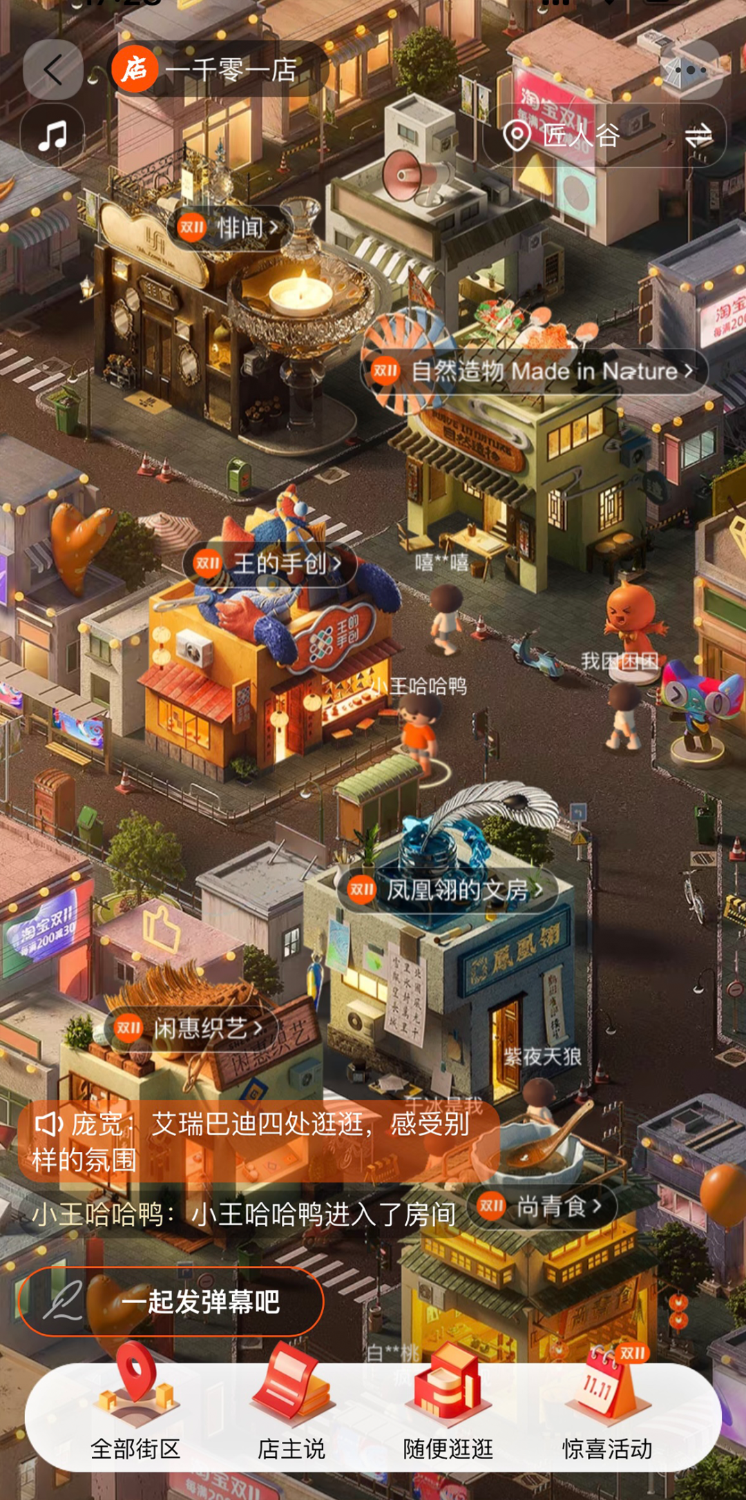 更值得一提的是,淘宝一千零一店为真正打造出沉浸式的交互体验,在各种细节方面也相当值得称赞,只要你进入店铺界面,店主都会站在门口迎接客户,街道上行人来来往往,还能通过弹幕实时交流。