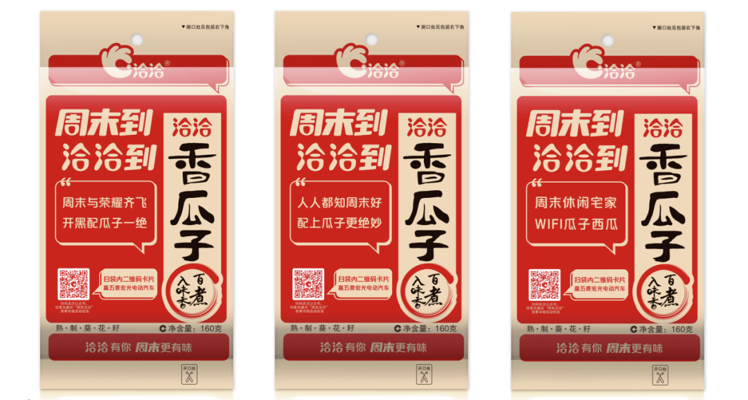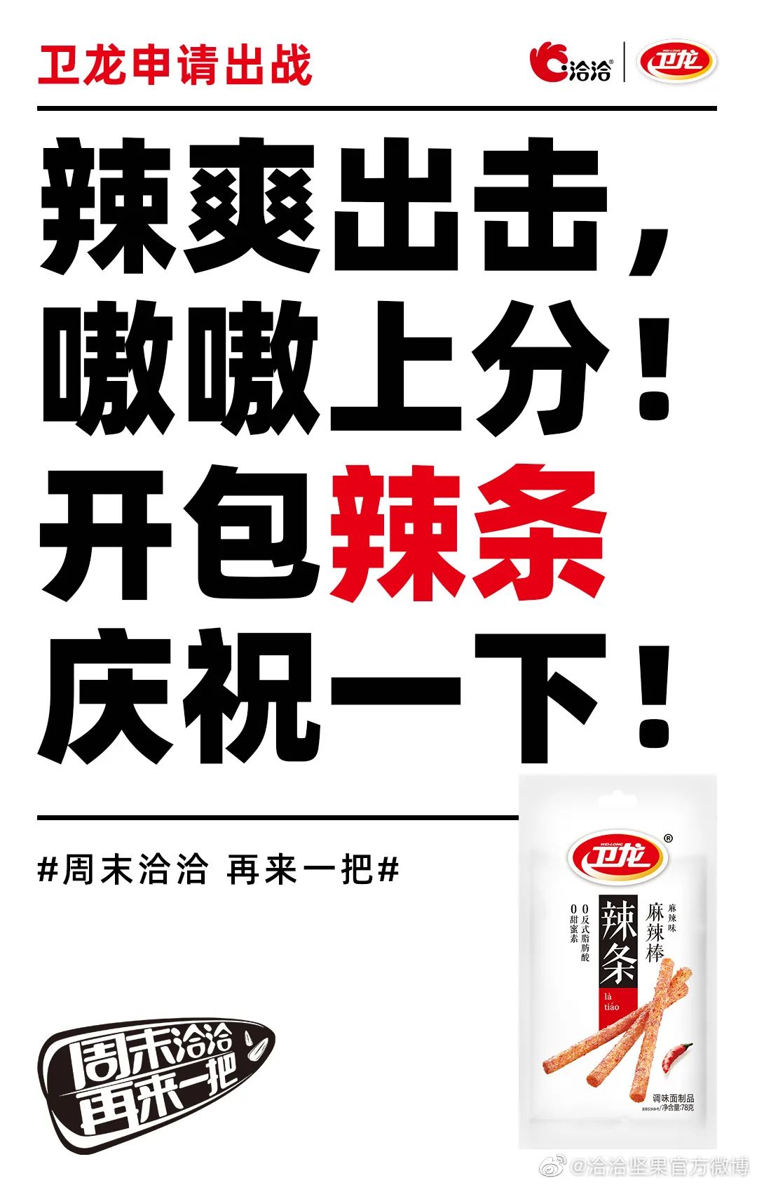曾几何时,“洽洽,快乐的味道”广告语伴着红黄相间的包装遍布大街小巷,深深印入每个人的脑海之中,但如今,那曾经一直陪伴的洽洽也渐渐在年轻人的群体中变得不常出现了。意识到问题的洽洽,近年来也在不断地做出改变,希冀能在消费者身边扮演重要的“零食角色”。“周末到 洽洽到”是解决品牌目前困局的一次尝试,目的是捆绑大众周末消费场景,以高频次出现加强消费者的印象。接下来叭扎嘿以洽洽所遇到的难题,来具体分析品牌这次布局的原因所在。提及瓜子,大家第一时间想到的就是洽洽,这是品牌在瓜子领域的强大优势,但品牌“成也瓜子、困也瓜子”。这主要是因为在大众认知中,嗑瓜子作为过年必备项目,是仪式感的重要组成部分,春节+瓜子已成为一种固定搭配,这就导致了春节时瓜子畅销,而在平常日子里,消费者很难想起“嗑瓜子”,于是,打破消费者固有认知刻不容缓,洽洽此次与周末场景捆绑,丰富瓜子食用场景成为解题关键。为了将品牌场景深入到消费者内心之中,洽洽还联动各大蓝V品牌,持续强化品牌与周末场景的关联。虽然洽洽在“瓜子”领域的地位遥遥领先,但行业内竞争对手如雨后春笋时时涌现,随着瓜子市场的逐渐饱和,品牌营收也将进一步收缩。因此,稳固品牌地位,需要洽洽打造更广的消费场景,“周末到 洽洽到”就是品牌找到的新引擎。02