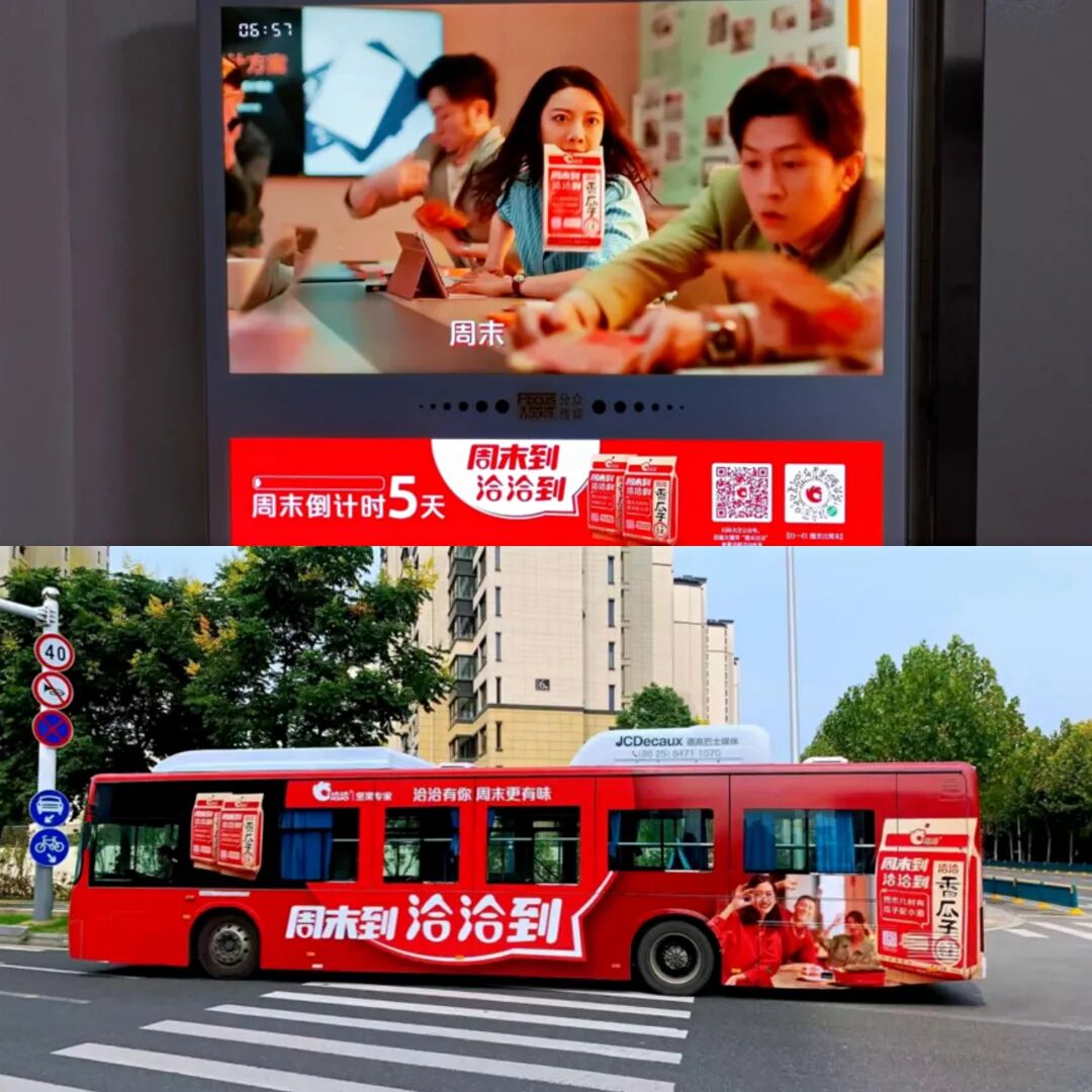 洽洽懂得年轻人这个心理,在短片中,选择考试的中学生、上课的大学生,加班的职场青年以及欢呼雀跃的老板,几乎涵盖了所有年轻群体,表达了他们对于周末的极度渴望,此时,在狂嗨的周末搭配能够解压的小零食——瓜子,就显得顺理成章,巧妙中将“周末”与“瓜子”形成了强捆绑。除了TVC与“周末场景”搭档外,洽洽还在包装上融入了“周末文学”:“周末休闲在家,WiFi瓜子西瓜”、“周末与荣耀齐飞,开黑配瓜子一绝”、“人人都知周末好,配上瓜子更绝妙”。这样直观的品牌表达,可以看出洽洽精准的掌握了年轻人最爱的社交文学,在轻松幽默中拉近了品牌与年轻人的距离感,当消费者每每拿起洽洽瓜子时,就在无形之中印象就更深了。锚定年轻人聚集的传播渠道,能为整场传播集聚更大的势能。洽洽不仅在抖音、微博、微信以及腾讯、爱奇艺等线上媒体平台多元布局,从开屏到话题渗透“周末到 洽洽到”概念,还在线下,辟如公交车、电梯、地铁、商圈广告等均做了投放,精准覆盖到目标消费者人群,让大家“目光所及之处皆是洽洽”。在多场景高频触发消费者,目的是将“周末到 洽洽到”深深刻在消费者的记忆中,激发消费者的需求,对产品的使用场景、消费场景等进行自我需求代入,最终与品牌产生交互。