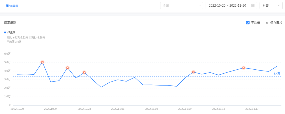 根据巨量算数数据显示,目前,抖音全网搜索“VR直播”,搜索指数已达到3.4万的平均值。9月以来,单日峰值最高还曾高达6.1万。
