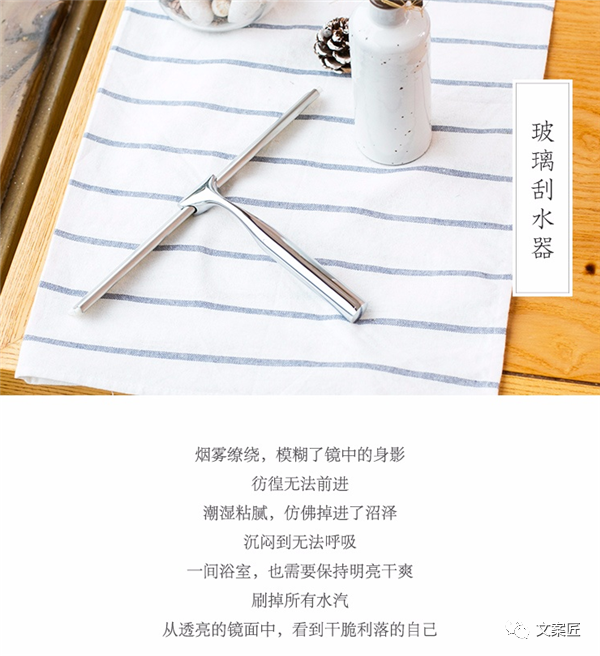 2、棉麻家居拖鞋:身处钢筋水泥的都市,让久别的自然重归脚下3、再生纸笔记本:每一张被你丢弃的纸,我们让它焕发新生9、山楂汽水:酸酸甜甜的原因,清爽细腻的原因,怦然心动的原因,都是因为这颗红果子啊咕噜咕噜,你听,又是淘气的铅笔在桌面打滚啦,应该怎么教训这个不听话的孩子呢?干脆让它立起来吧!来一个如同月牙的笔袋,Q弹得触感瞬间激活大脑中心,仿佛到了UFO旋转,仿佛看到了外星人的招手,走吧,一起离开地球表面记得在儿时的夏季,外婆常坐在溪边锤衣,清脆的水声搭配阵阵蝉鸣,将洗干净的衣服晾在阳光下,淡淡的皂角香追随了家人的一生,这是关于一块皂的记忆,幸好,它从未被抹去拒绝沉重繁冗,聪明脑袋学会轻简出行,用一只立体的小馒头包,放进手机、化妆包、书籍,随身物不变,负重更轻盈上周买的彩票竟然中了头奖,暗恋的女神突然向自己表白,平时严厉的老板忽然要给我放暑假,我难以抑制地笑出了声,难道我今天起要走上人生巅峰?浪漫是女人的天性,幻想一曲裙摆摇曳的圆舞,渴望一场星光满天的恋爱,在花鸟风月里,绽放如诗一般的自己居家时分,也要保持骄傲优雅的踮起脚尖,不用逞强做自然的风度,走最安心的路23、玻璃刮水器:刷掉所有水汽,从透亮的镜面中,看到干脆利落的自己24、电动牙刷:偷懒却不将就,一键自动,让每天的愉悦从清晨的微笑开始25、女士内裤:哪有那么多的风花雪月,一套基础的内裤才是最柔软最安心的底线26、隐形内衣套装:不隐形的内衣,把主角风光抢尽,要之何用27、床头柜:清晨的第一杯水,深夜的最后一抹光,守候在床边的小精灵给你28、男士方包:你的分身不暇,就让一款斜跨方包为你收纳琐碎29、口罩:空气中失去了春泥的气息,只留在尾气和雾霾的萦绕里不论晴天还是雨天,你都需要一把伞,撑开它,撑开一个属于自己的小小世界穿上一双合脚的浴室拖鞋,心情原来可以像水流一样温柔喜欢撕拉齿轮划出工整边缘,喜欢日复一日,一圈又一圈,似在听光阴与陪伴的故事
