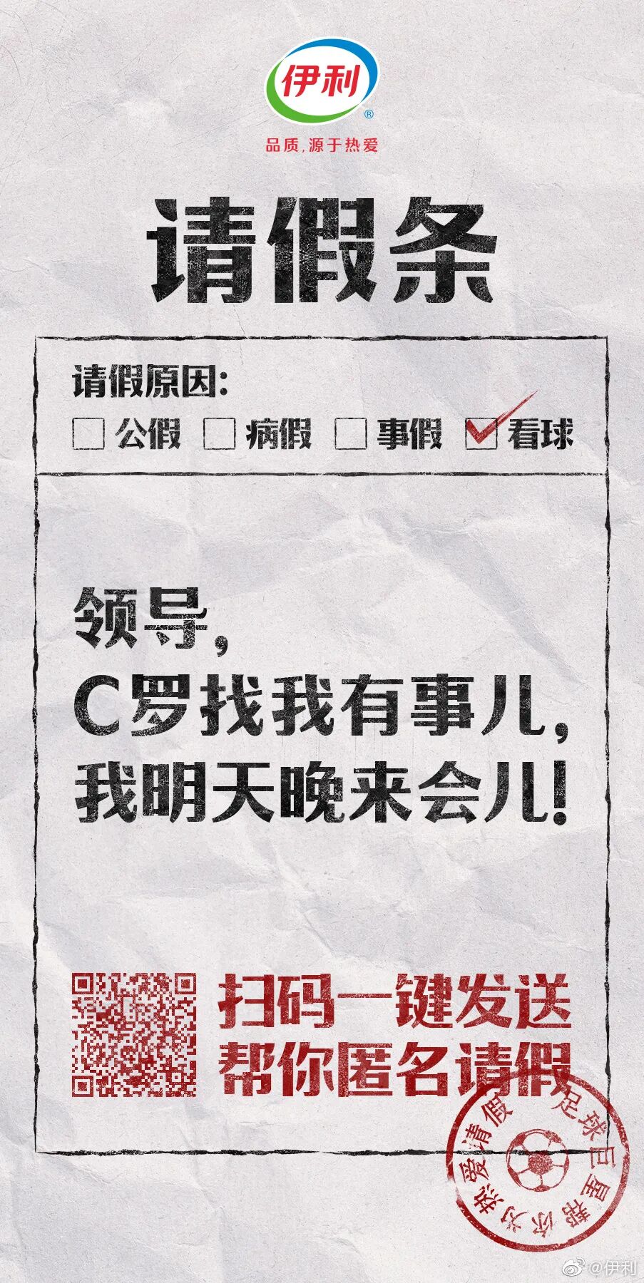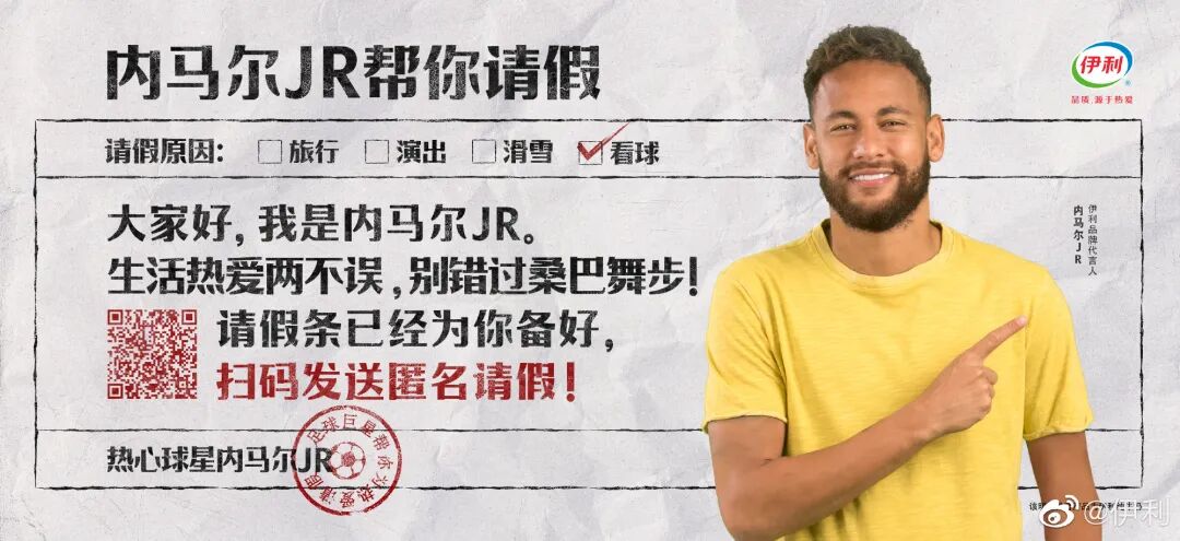 内马尔人气颇高,被称为“最后的桑巴足球舞者”的他,在世界杯期间持续霸占了热搜榜。他高超的球技、帅气的长相,还有励志的经历,吸引了一众迷妹,无论是微博和抖音都随处可见内马尔。伊利此次携手内马尔帮打工人请假,在这张请假条上理由是:“生活热爱两不误,别错过桑巴舞步”,这么贴心的请假条,相信不少职场人看到都被暖到。不仅有内马尔、还有伊利代言人C 罗和贝克汉姆。请假条上的文案十分贴心,说出了不少球迷的心声:伊利主张生活和热爱都不可辜负,连请假理由都帮你想好了。扫描伊利的H5,挑选球星,生成请假条,输入老板邮箱就可以匿名发送邮件。向右滑动查看更多