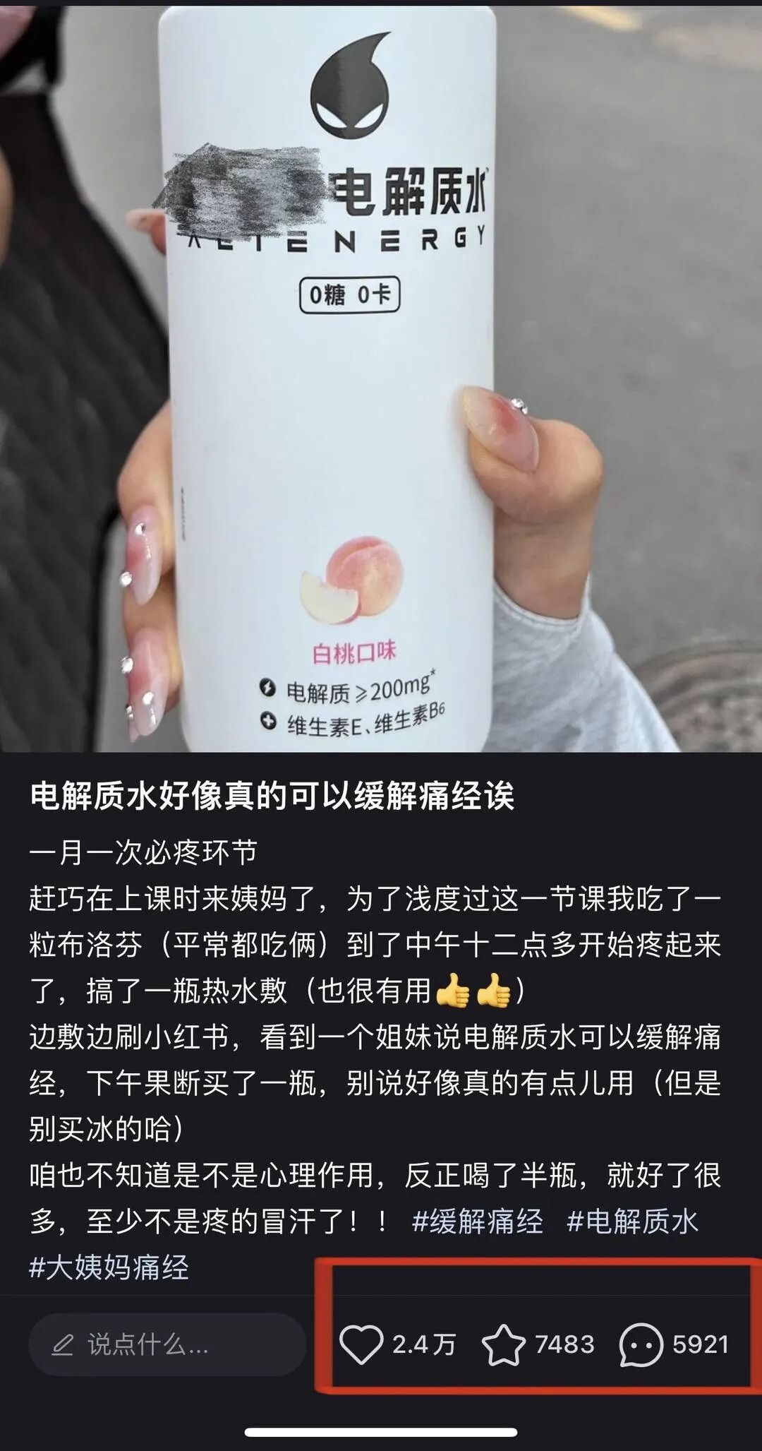 在小红书搜索“电解质水”,6万篇笔记里能看到曾经外星人电解质水的热门安利里,掺杂着“缓解痛经”、“帮助减肥”等神奇功能。当然官方也可以“撇清关系”,不过在旗舰店的评论区里仍然有人认真询问:这个真的能缓解痛经吗?南京市第一医院疼痛科主任医师徐晨婕曾在采访时提到喝含镁元素的电解质饮料可能会帮助缓解疼痛,但饮料里的元素含量有限,更何况外星人里没有镁元素。