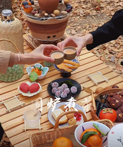 “围炉煮茶”甚至搭上火热的露营,边露营边“煮茶”。除了各种常规点心和板栗等烤物,有些露营店家还会提供烤肉、水果采摘等消费行为。