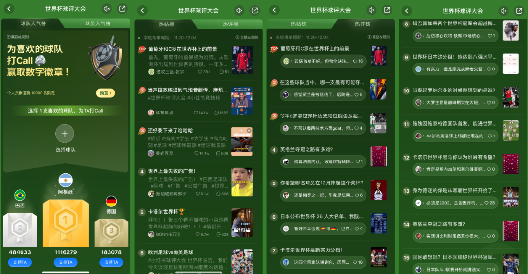 在世界杯正式开幕前,抖音就已经上线了世界杯专题页,甚至更改了App图标。除了全场次赛事直播这种“基本操作”外,还上线了各类互动活动与衍生节目,为这场体育盛世做好了充足的准备。除了抖音外,B站创建了“整点不一样的足球”、“其实我也是球迷”等话题,鼓励up主参与世界杯相关内容的讨论与创作;小红书上线“世界杯球评大会”,搭建畅聊赛事的社区;知乎设置世界杯相关的议题,让答主围绕历史、人文等相对专业的角度展开分析……各大平台似乎都想搭上世界杯的顺风车,获得流量与商业化的提升。