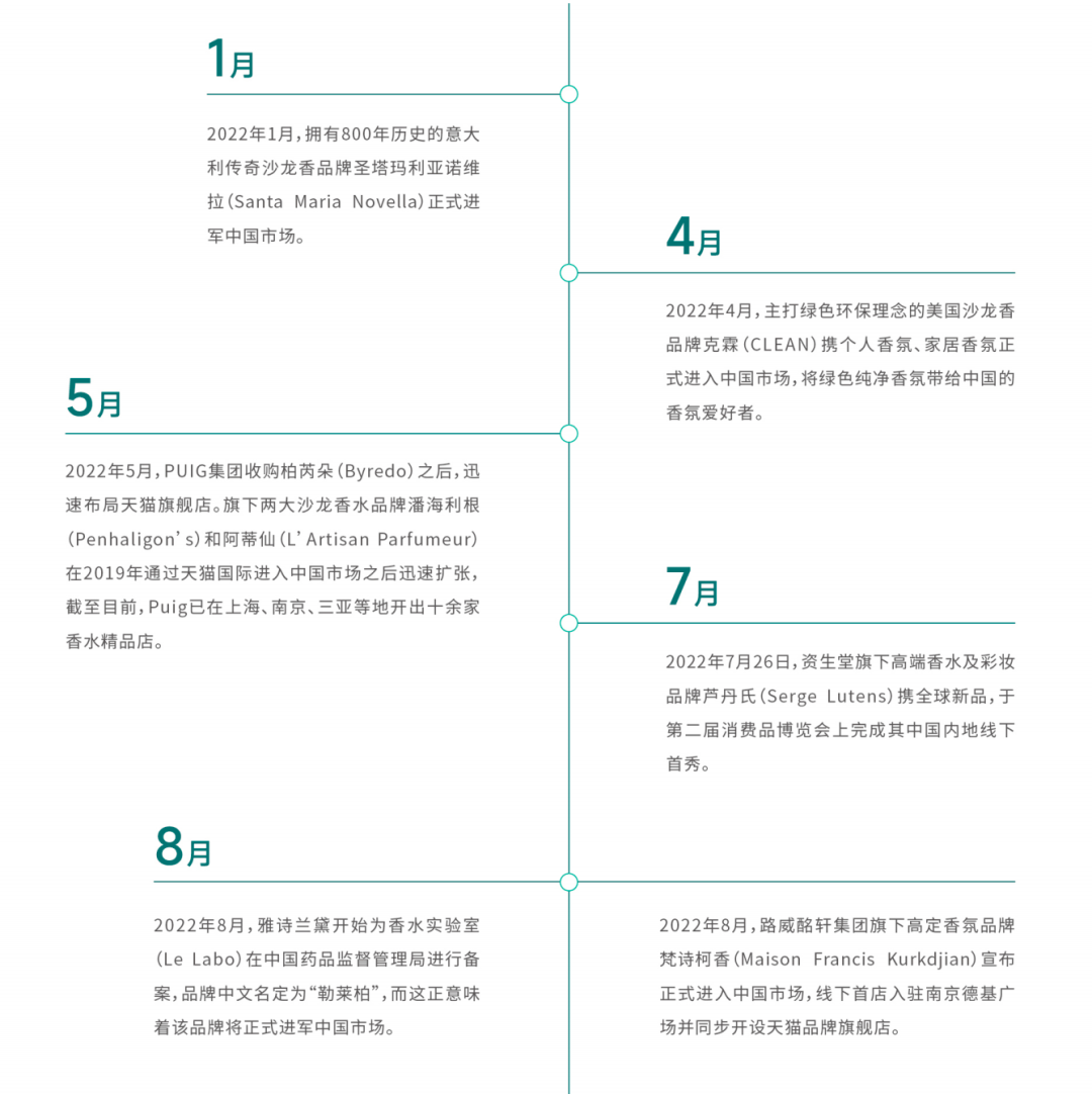 与此同时,在2022年,中国市场还在不断吸引世界各地的沙龙香品牌前来掘金。据不完全统计,意大利沙龙香品牌圣塔玛丽亚诺维拉(Santa Maria Novella)、美国沙龙香品牌克霖(CLEAN)、PUIG集团旗下柏芮朵(Byredo)、资生堂旗下高端香水及彩妆品牌芦丹氏(Serge Lutens)、LVMH集团旗下高定香氛品牌梵诗柯香(Maison Francis Kurkdjian)纷纷宣布正式布局中国市场。