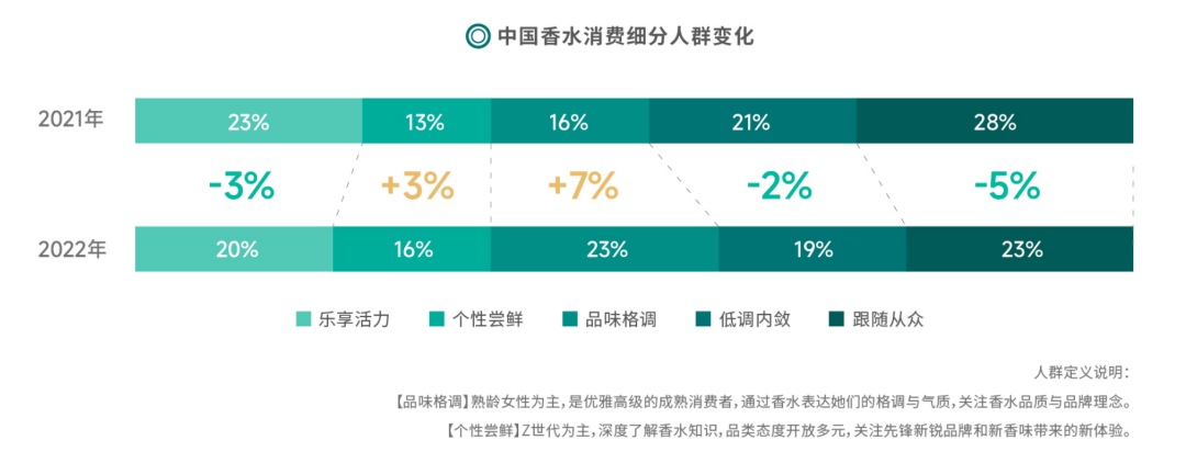 相较于2021年,绿叶调普遍受到资深人群(品味格调、低调内敛)的偏好;跟随从众和乐享活力人群对于果香调的喜爱度提升明显;相对小众的甘苔调则受到个性尝鲜人群的认可。