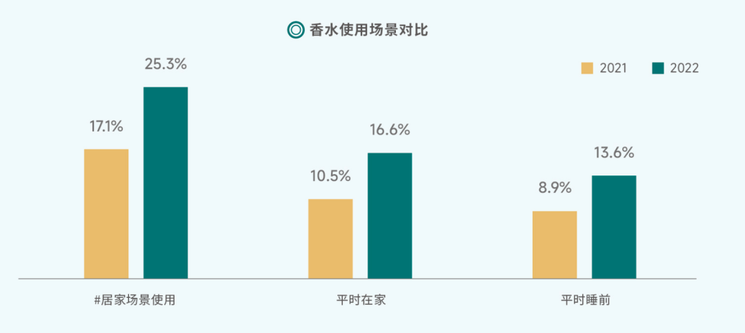 与此同时,高级别城市消费者每周使用香水的次数从7.6次增加至9.9次;44.9%的消费者表示每天都会使用香水,其中每天会多次使用香水占比达18.3%,较2021年上升3%。居家场景的香水使用占比也明显增加,较2021年增加8.2%。