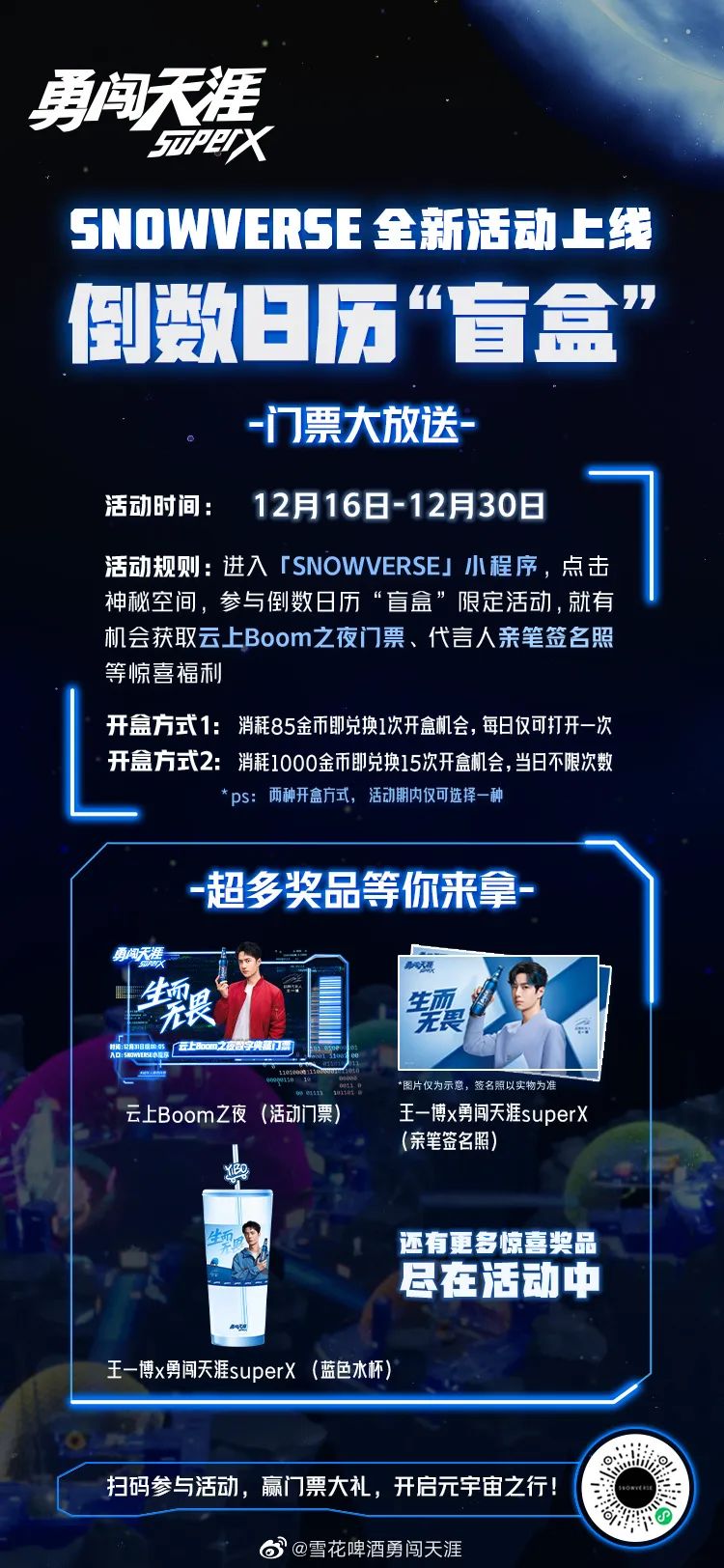 此外,雪花啤酒勇闯天涯还在SNOWVERSE元宇宙空间上线倒数日历“盲盒”限定活动,借“盲盒”玩法与云上Boom之夜门票等多重福利的双重刺激进一步释放粉丝参与势能,以强交互性的金币玩法设计解锁元宇宙互动。