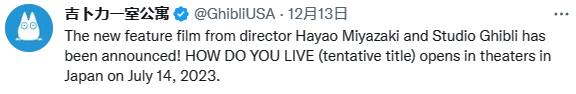 由宫崎骏担任原作、脚本、导演,吉卜力工作室制作的新动画《你想活出怎样的人生》近日宣布定档,预计将于2023年7月14日在日本上映。