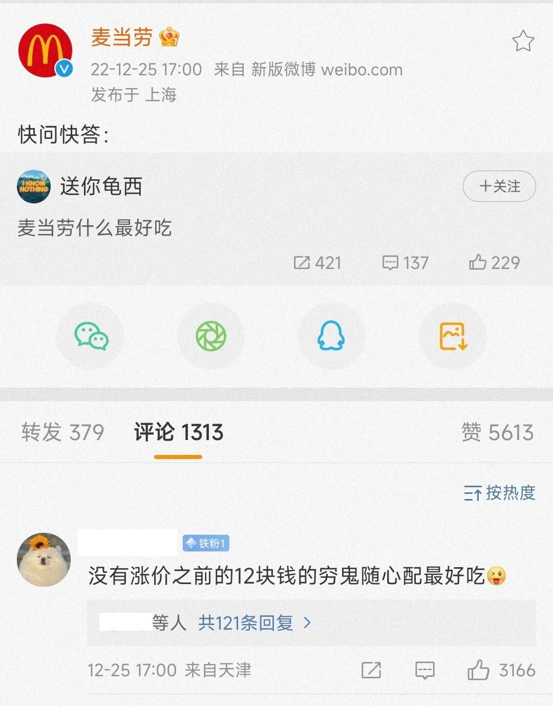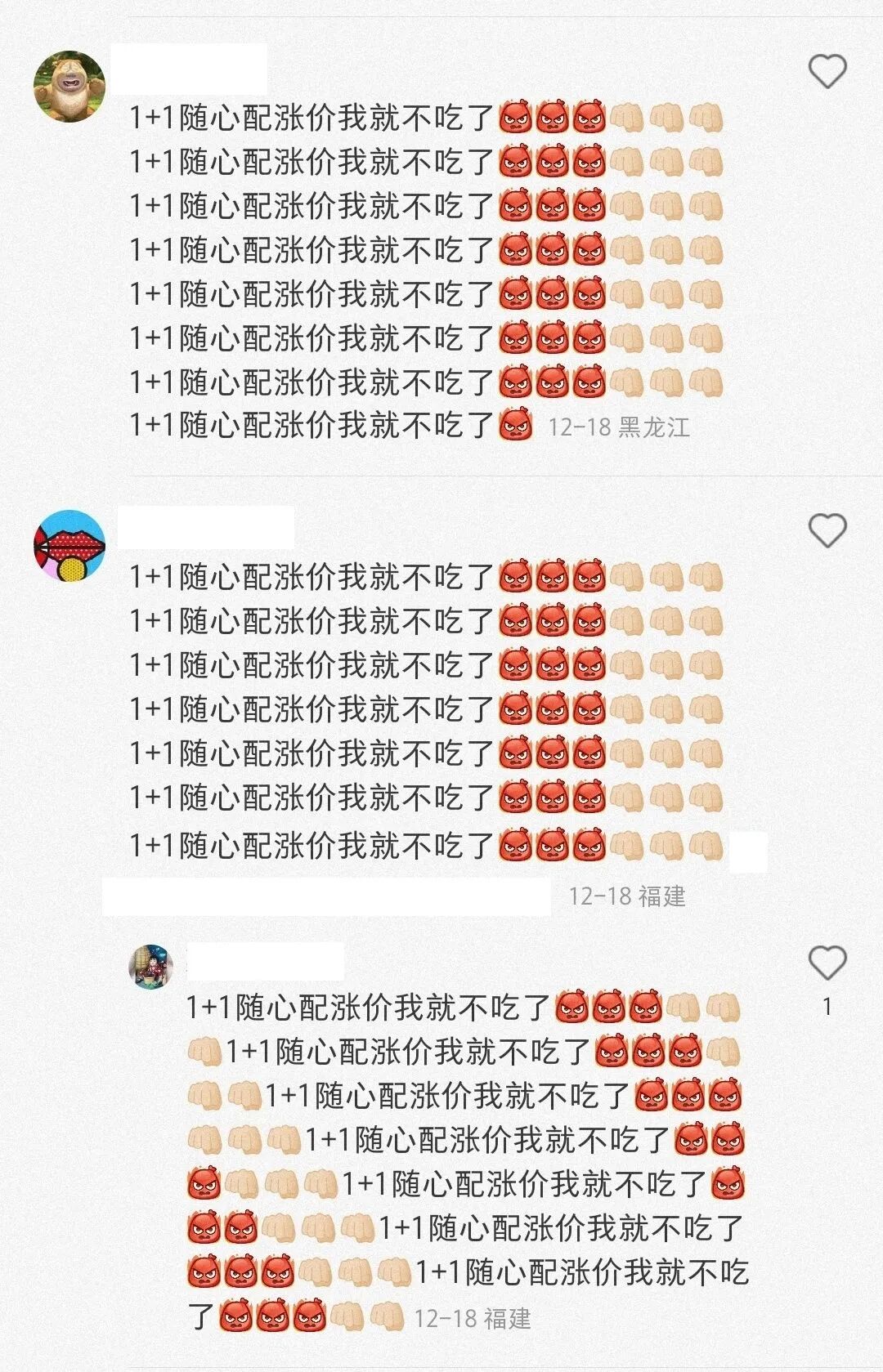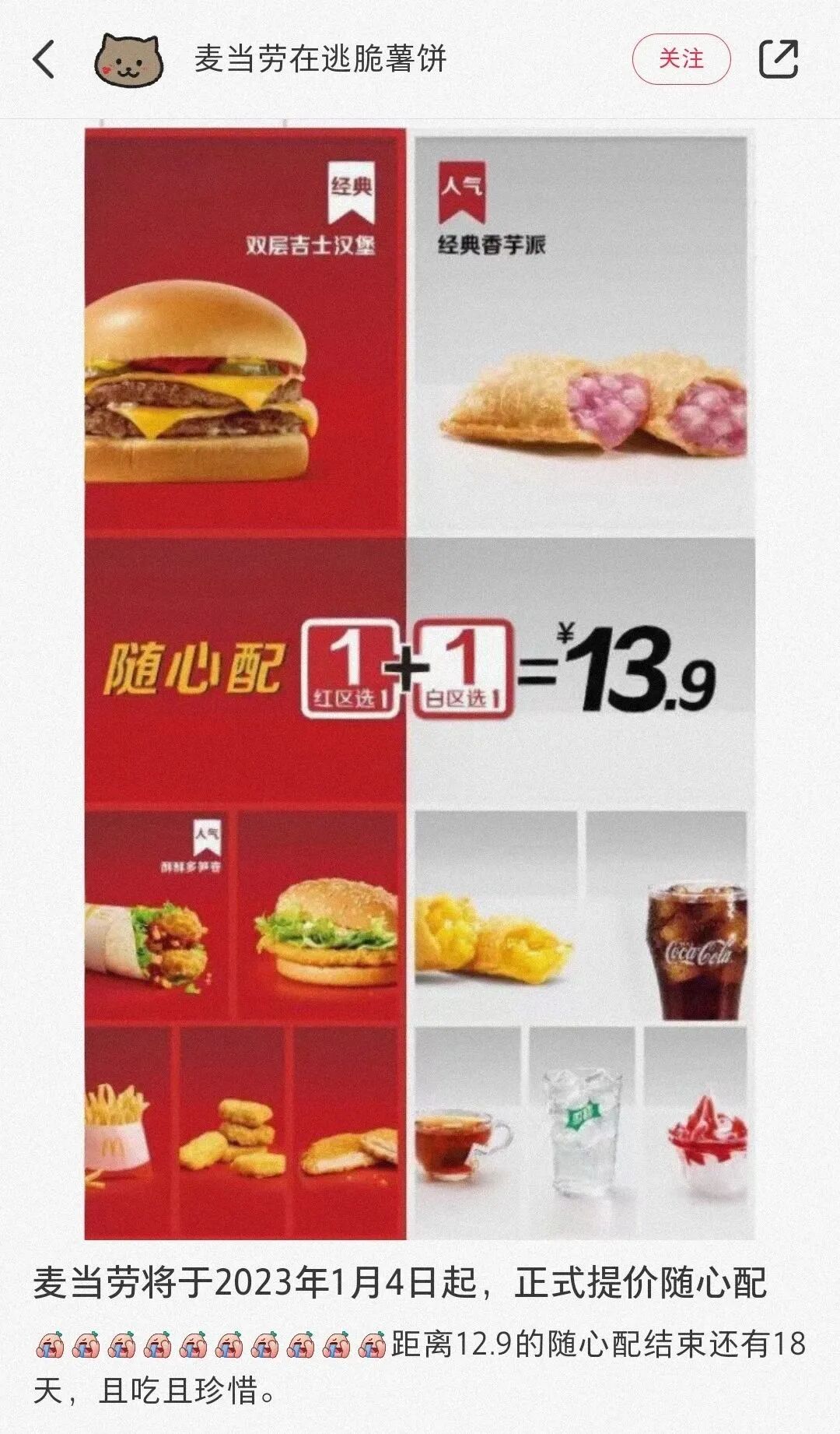 每次他都能以最快速度发布有关麦当劳新品/优惠信息,因此他也被粉丝们尊称为“薯饼老师”。而在前几天,薯饼老师发布了一条令人震惊的消息,立刻吸引了网友的关注。那就是:麦当劳将于明年1月4日起, 正式提价随心配。因为麦当劳并不是第一次涨价1+1了,它上一次涨价,刚好就在一年前的这个时候。我当时还写文章说过这件事,当时麦当劳是将1+1的价格从12元提至12.9元。一年后1+1随心配再一次涨价,难道这是要每年都涨一块钱的节奏吗?对于麦当劳再次提价1+1,不少网友都表达了自己的不满。他们认为,麦当劳正在逐渐拉低消费者的底线,慢慢从我们那赚更多的钱:也有网友自发在各个评论区刷起了“抵制”麦麦的评论(感觉还是以玩笑为主):有意思的是,一向“话痨”的麦当劳官方微博却罕见地一直不回应粉丝的吐槽,大概也在变相默认此事了。在他们看来,1+1=13.9元的问题不是很大,只要双吉还在,那它依然能配得上“穷鬼套餐”的这个名字:还有的网友则比较“理智”,他们在接受涨价的同时,也表达了增加新面孔的希望。我也觉得他们讲得挺对的,如果能把板烧或者麦麦脆汁鸡这些热门单品加进去,那涨价似乎也不是不能接受:在我看来,麦当劳去年涨价和今年涨价,面临的情况是完全不一样的。去年麦当劳涨价时,它在“穷鬼套餐”这块的对手不多,仅仅就肯德基的“疯狂星期四”。而我们现在都知道,肯德基的星期四并不疯狂,味道和性价比都不高。尽管去年麦麦的随心配涨了0.9元,对其影响并不是特别的大。越来越多的快餐店get到了1+1随心配的魅力,它们纷纷开始推出专属于自己的“穷鬼套餐”。比如周二塔斯汀,汉堡可乐第二份1元,13元+就能吃饱:周三,汉堡王国王日,9.9随心配,有甜点、饮料配主食,除此以外消费满20的话,还能0元购买一份霸王鸡条,性价比超高:而除了汉堡王国王日,周三还有达美乐披萨小程序披萨打七折、这天同时也是必胜客尖叫日,全场披萨七折:周五,海底捞下午14:00-17:00/22:00-次日7:00打6.9折(仅大学生)。周末再点个华莱士半价餐(事实上华莱士可不止周末有活动),美好的一周就这么结束了。相比于友商频出优惠力度更大的活动,麦当劳穷鬼套餐的优势已经逐渐被蚕食殆尽。可以预见,如果麦当劳继续涨价的话,将会有更多对价格敏感的消费者,倒向更实惠的塔斯汀和汉堡王这边。当然了,麦当劳穷鬼套餐哪怕2连涨,也还是比肯德基疯狂星期四的套餐内容要出色的。