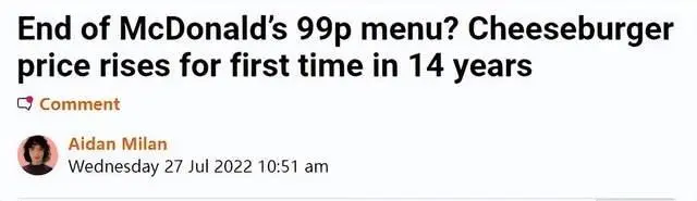 另一方面,除了竞争压力加大,麦当劳穷鬼套餐菜单的固化,也受到了不少小伙伴的诟病。原本加进1+1的新品没能常驻,白区可选择的单品也乏善可陈,现在的1+1急需新面孔出现来调动消费者的积极性。从去年麦当劳公布的原因来看,涨价涉及到原材料和运营成本上涨,今年应该也不例外。比如英国的麦当劳,就将芝士汉堡从现在99便士一个的价格提高到1.19英镑。
