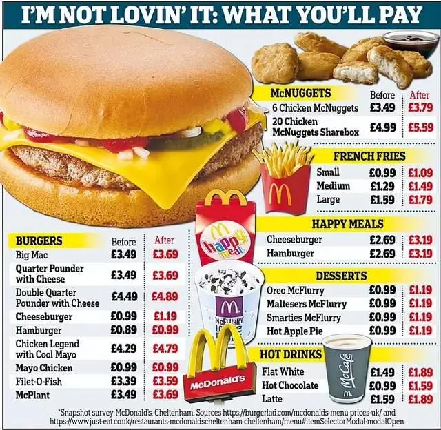 汉堡系列基本统一提了价,鸡块、薯条、冰淇淋等等也都有不同幅度的价格上调,一般都上涨了10至20便士。有很多网友纷纷晒出了麦当劳的价格,表示新价格让人无法接受。特别是在与2019年的价格进行对比以后,差距非常明显,不少人直接表示麦当劳的新价格仿佛在开玩笑。那么麦当劳穷鬼套餐再涨1元,你能接受吗?