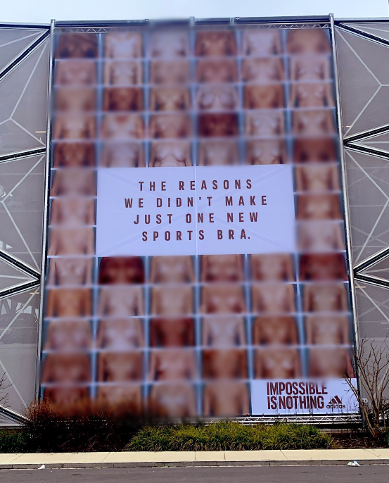 比如运动品牌adidas,为了鼓励每位女性找到适合自己胸型的内衣,找来肤色、身材、胸部皆不同的女性,拍摄一组“乳头解放”的海报广告。