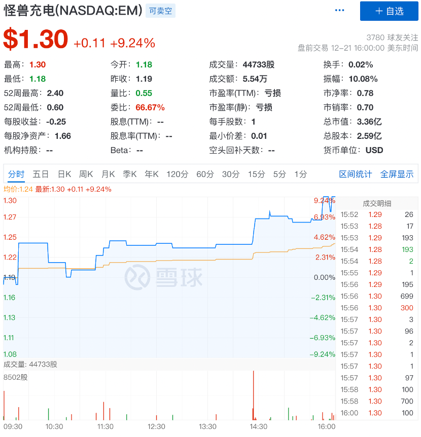 然而上市即巅峰,在此后的一年多时间内,怪兽充电绝大部分均处于破发状态。截至2022年12月21日,1.30美元的收盘价较发行价跌去了85%左右。