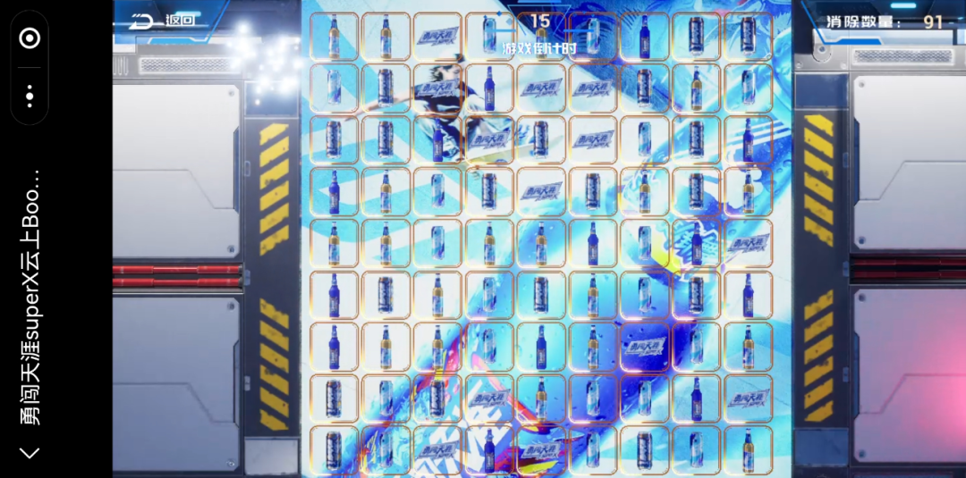 而在点瓶焕蓝游戏区,上方会随机掉落一波灰色的superX啤酒瓶,玩家需要点击画笔按钮唤醒上色;无限碰撞游戏更像是3D世界的快乐消消除,将最少三个相同的superX品牌标识或啤酒瓶啤酒罐连成一线,完成消除。
