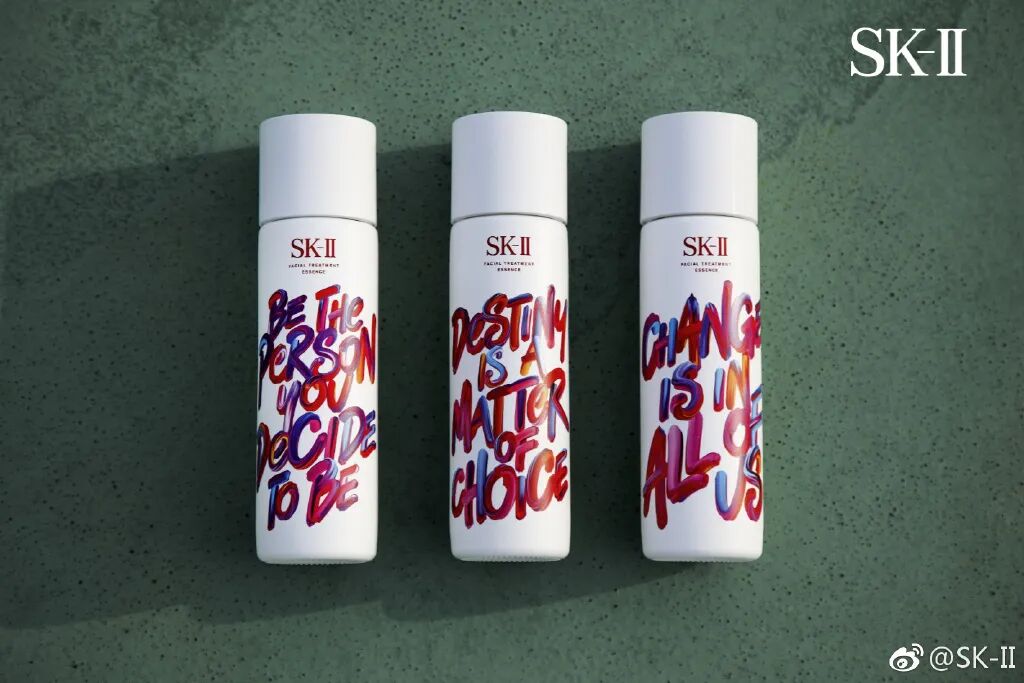 2017年,SK-II推出三款#改写命运#宣言版:潮流艺术字体搭配三款不同英文的包装,寓意“改变”、“命运”、“决定”,诠释真我态度。图片来源SK-II 微博
