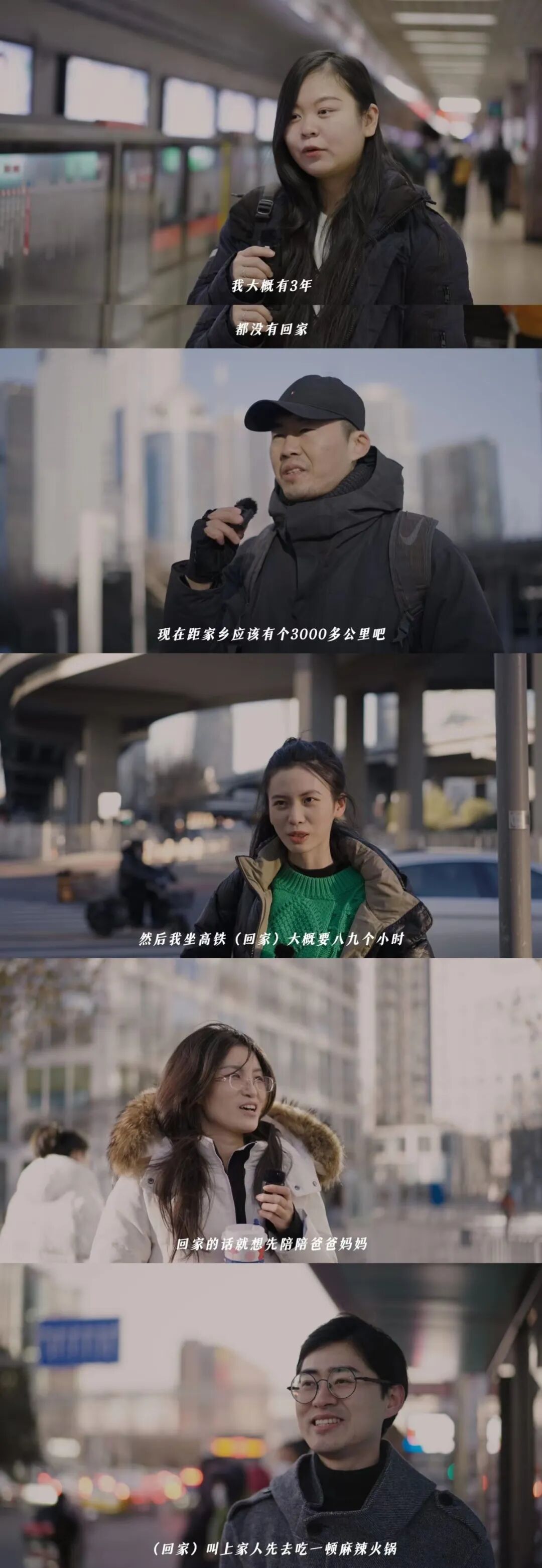 视频里采访了一些普通人,有人三年没有回家,有人距离家乡三千多公里,有人高铁得坐八九个小时才能到家。问题抛出来,视频里的人用数字代替想念,而屏幕面前的观众,心里也会有一个答案。
