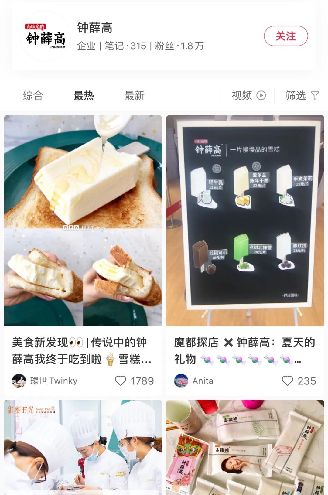 钟薛高,利用social方式传播,不停发出新声音、打造新话题。钟薛高几乎没有传统TVC广告,而是热衷于用social方式来进行品牌口碑传播。在遍布微博、小红书等社交平台的种草分享中,你能从一千个不同的消费者眼中看到一千种不同的钟薛高。 在小红书上,搜索钟薛高能跳出来超3500篇长笔记。据说,在小红书里每3个吃货就有1个认识钟薛高。