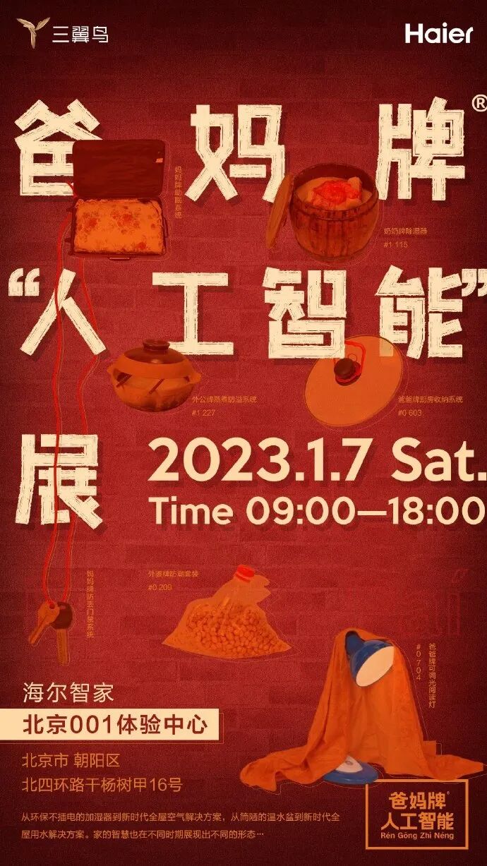 网友们分享的这些“爸妈的办法”,成为三翼鸟线下主题展览的灵感来源。从1月7日开始,名为“爸妈牌人工智能”的展览在北京、广州的海尔智家001体验中心拉开帷幕。