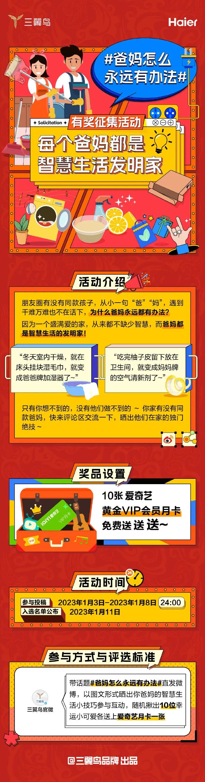 1月3日,三翼鸟官方微博抛出“爸妈怎么永远有办法”这样一个生活感十足的互动话题。除了丰厚的奖品吸引,该话题本身极具可聊性,一秒激发广大网友的表达欲,引发广泛而热烈的讨论。