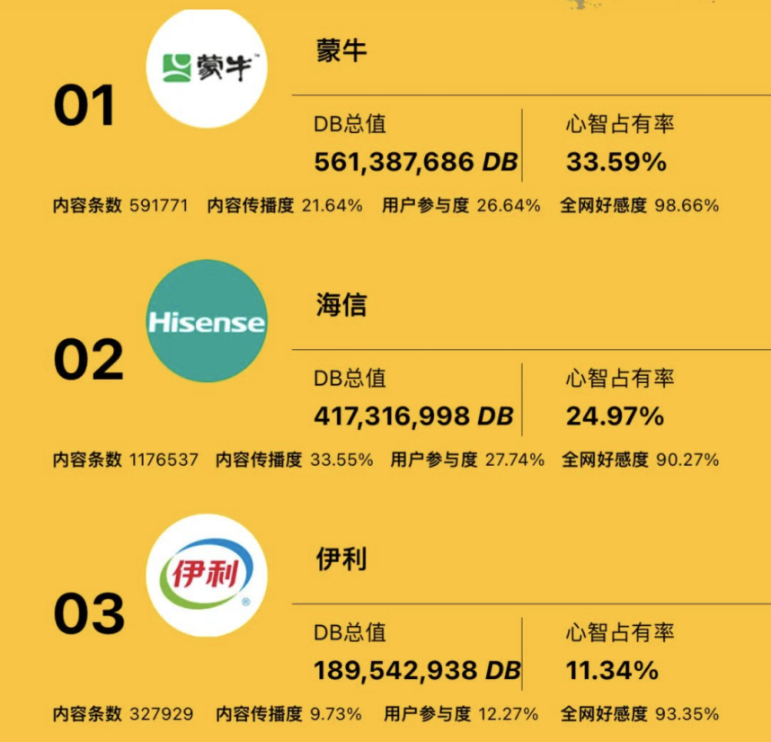 而就在前不久刚过去的世界杯上,蒙牛和伊利还分别占据了《数字品牌榜》2022 世界杯品牌营销榜终榜第一名和第三名的位置,其中蒙牛豪掷重金成为2022年卡塔尔世界杯全球官方赞助商,据GlobalData数据,仅赛事赞助费用,蒙牛投入就达6000万美元,另外,又靠着“押注”代言人姆巴佩和梅西,双双冲进决赛,手心手背都是赢。